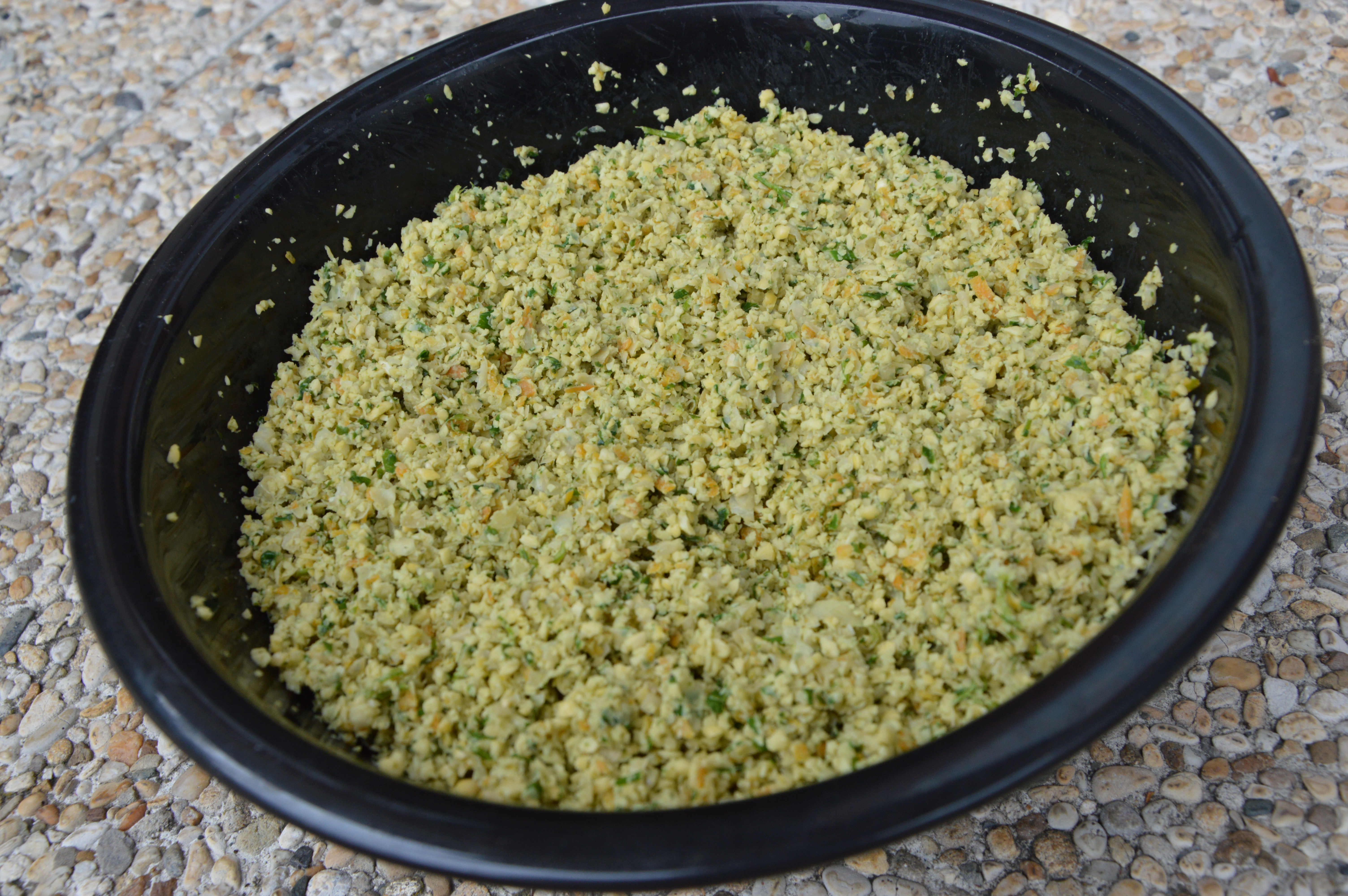 Add the coriander and parsley leaves, cayenne, flour, oil, salt and pepper and keep processing. The mixture should look like the texture of couscous and a paste. It should have the consistency of a lumpy paste. Don’t overprocess it – you don’t want it turning into hummus!