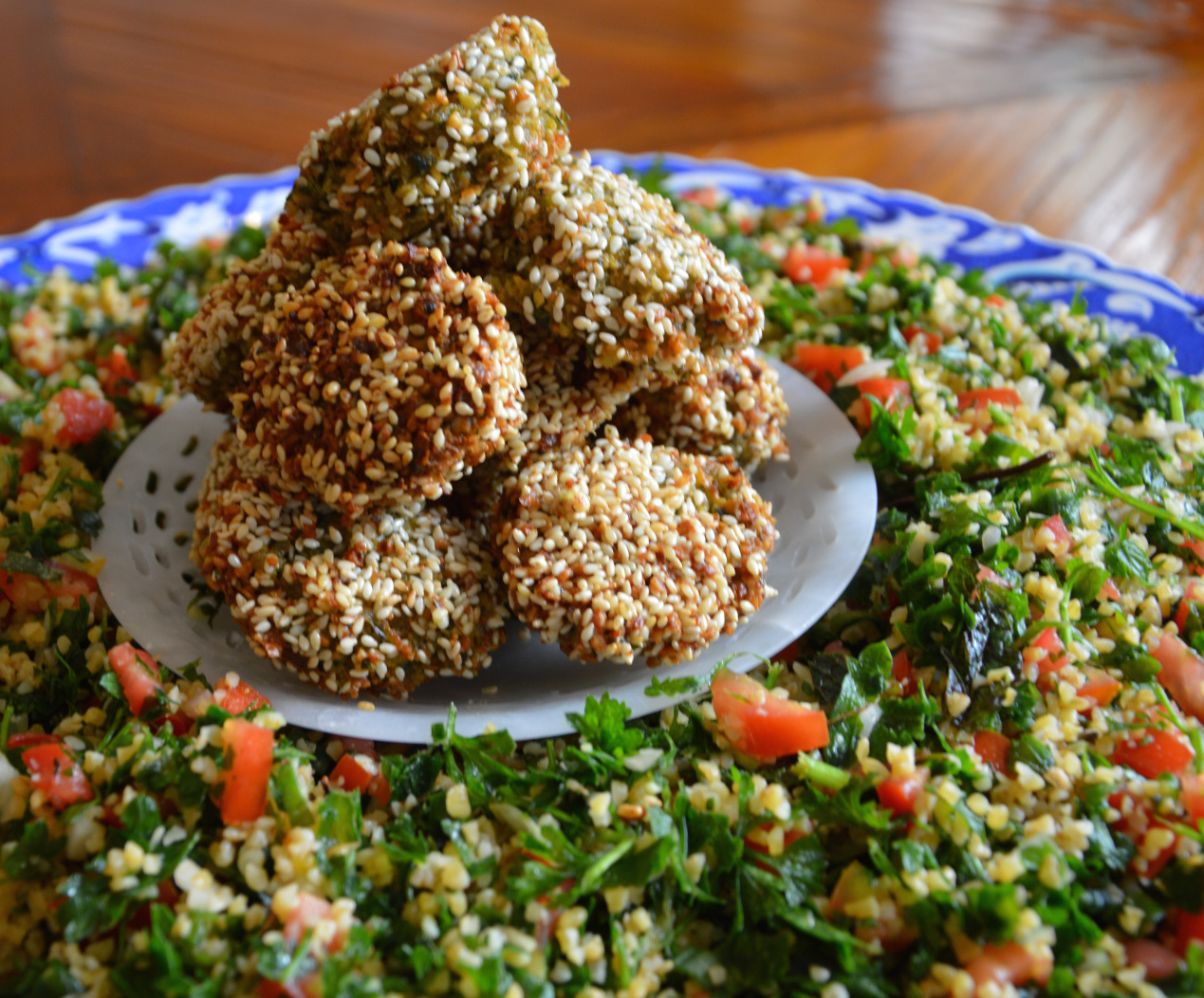 For a complete meal, I like to serve falafels with tabbouleh – a traditional Lebanese salad that my husband John, who is half Lebanese by descent, grew up with.