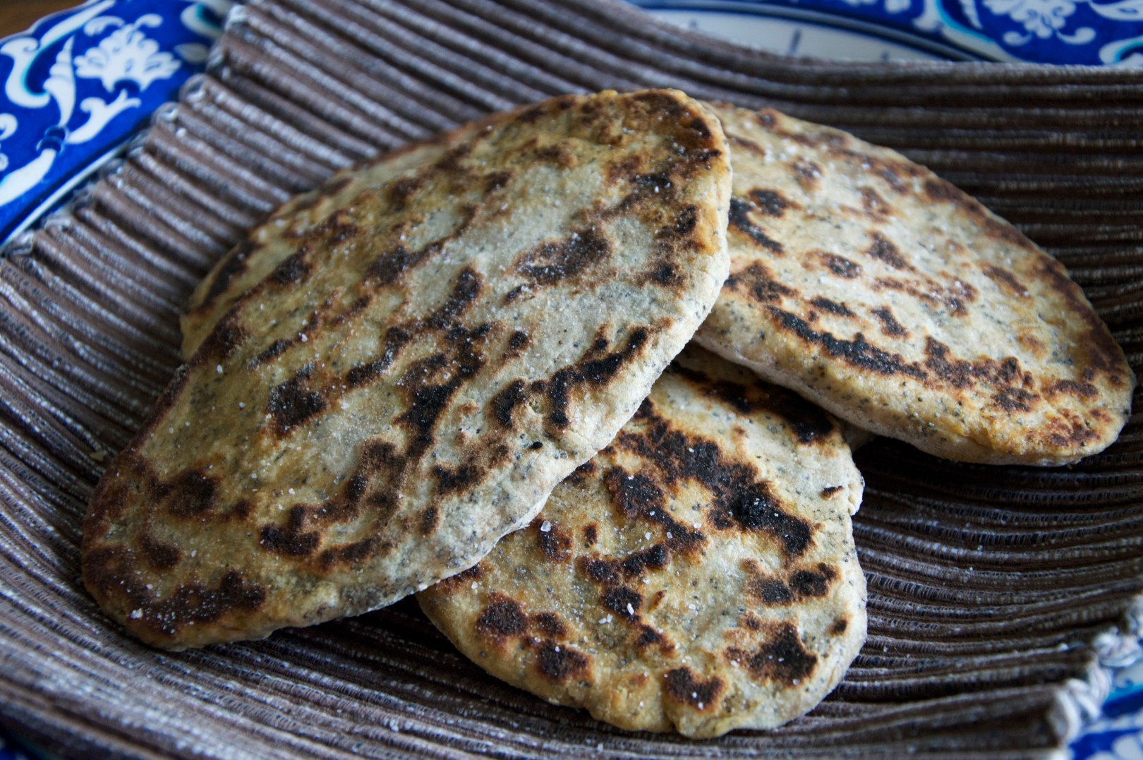 Soft and chewy Naan bread is irresistable when served warm with Indian Dal or other curry dishes. After experimenting, I came up with this Naan recipe, which consists of a blend of fine wholewheat and white flours, yoghurt and poppy seeds.