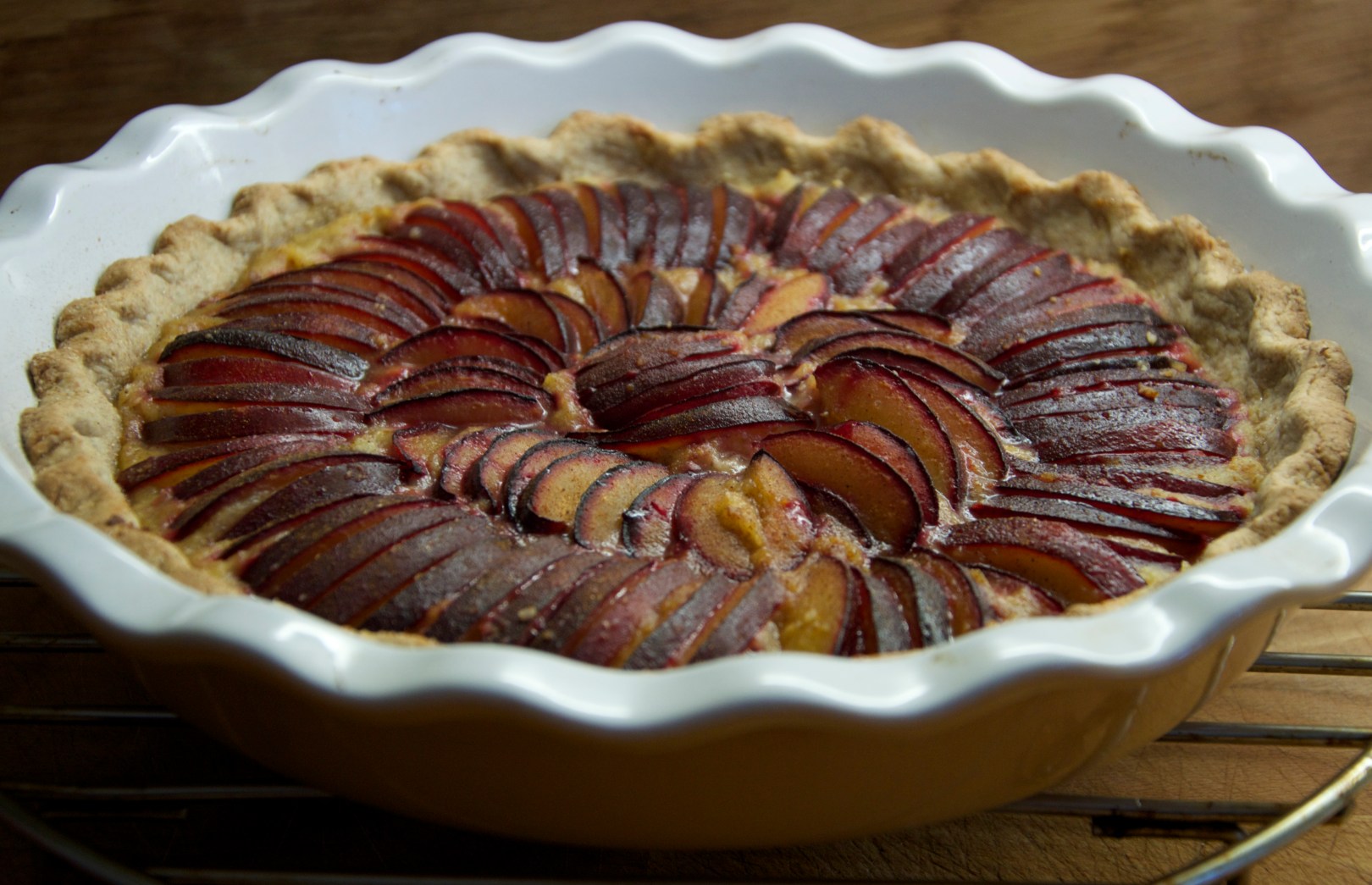 When I took the picture of the plum pie above, I had just taken it out of the oven and the plums were still bubbling in the apple custard. For the crust, the mix of white whole wheat flour, white wine and olive oil gives it a rustic flavour and texture, which is perfect for this time of the year!