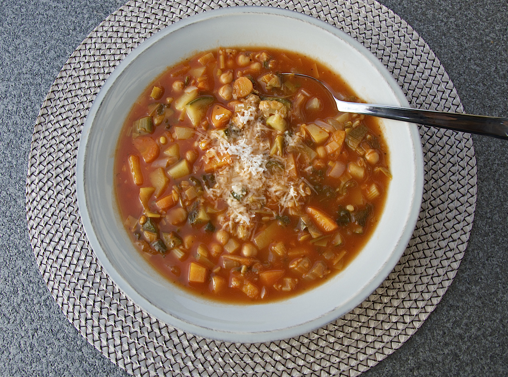 When I got home, I wanted to keep busy so I made a vegetable soup with lots of chunky vegetables. Sometimes the best things are the simplest things. This soup tastes great on a cold winter’s day. (It’s also comforting when your child goes back to university!) With the vegetables, chick peas, lentils and pure tomato purée, one bowl of this soup is a complete and healthy meal.