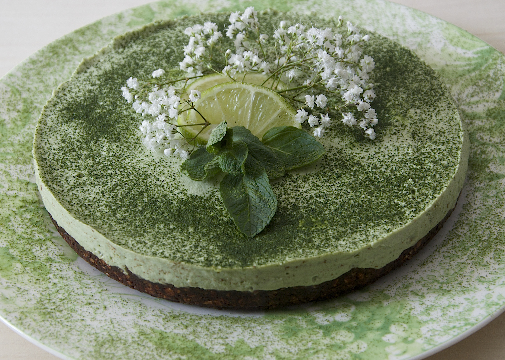 This cake filling is made with fresh mint leaves, raw cashews, green seedless grapes, lime juice and almond milk. The base is a mix of almonds, oats, cacao, medjool dates and maple syrup. I sprinkled the top with Matcha green tea powder, but go ahead and decorate it as you want.