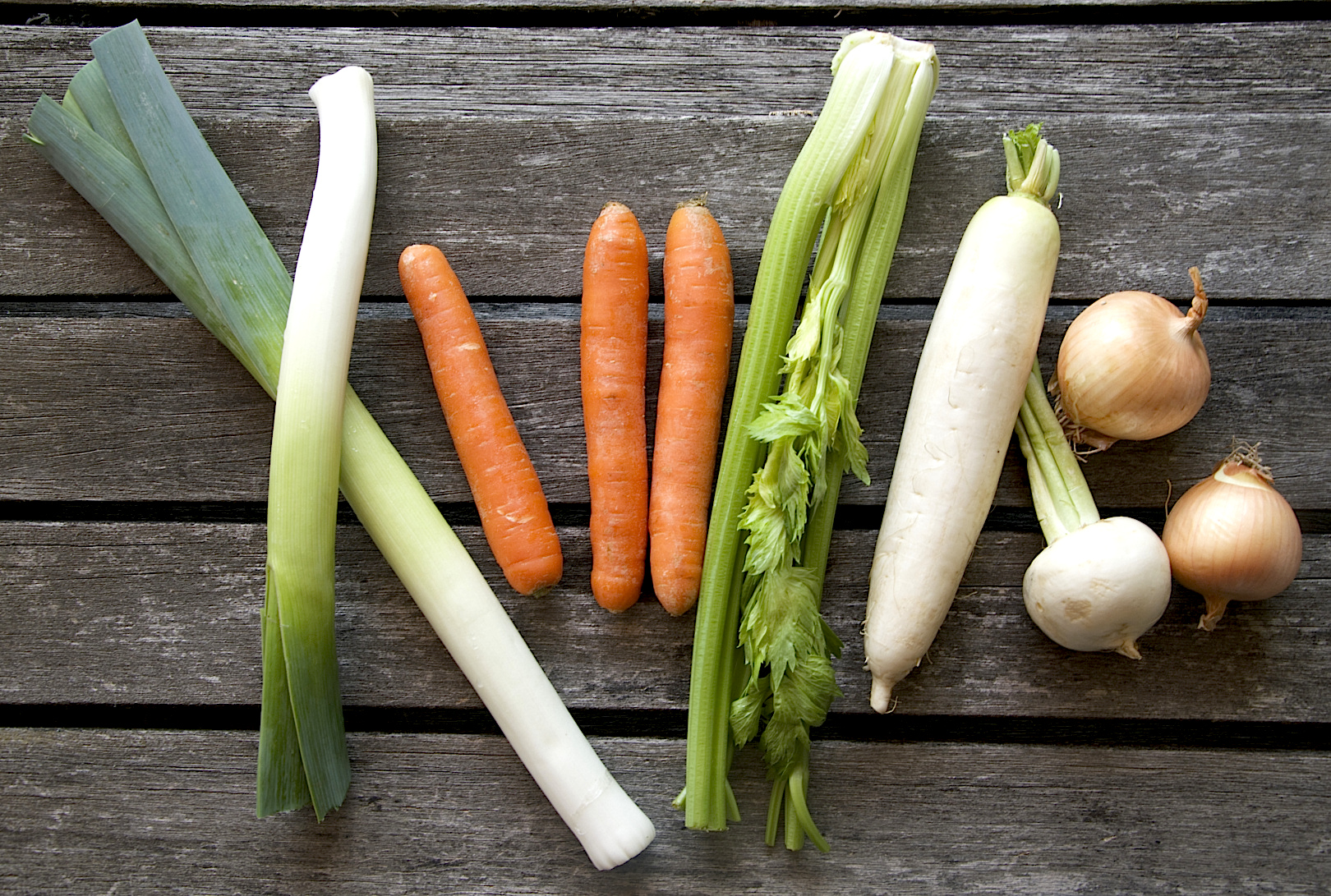 When I make the stock, I use basic root vegetables, such as carrots, celery (or celeriac) and onion and keep it all very simple. For a change, I sometimes add leeks or other options (see below).