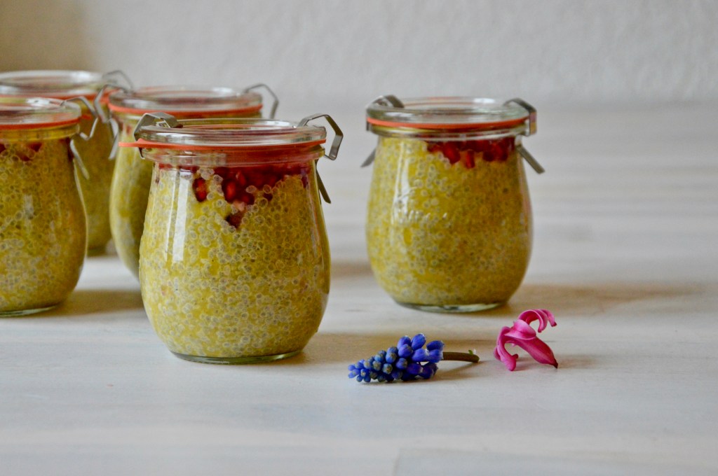 I made these healthy tropical fruit cups with almond milk, a large mango, a large orange, chia seeds and few tablespoons of maple syrup. I then topped them up with pomegranate seeds.