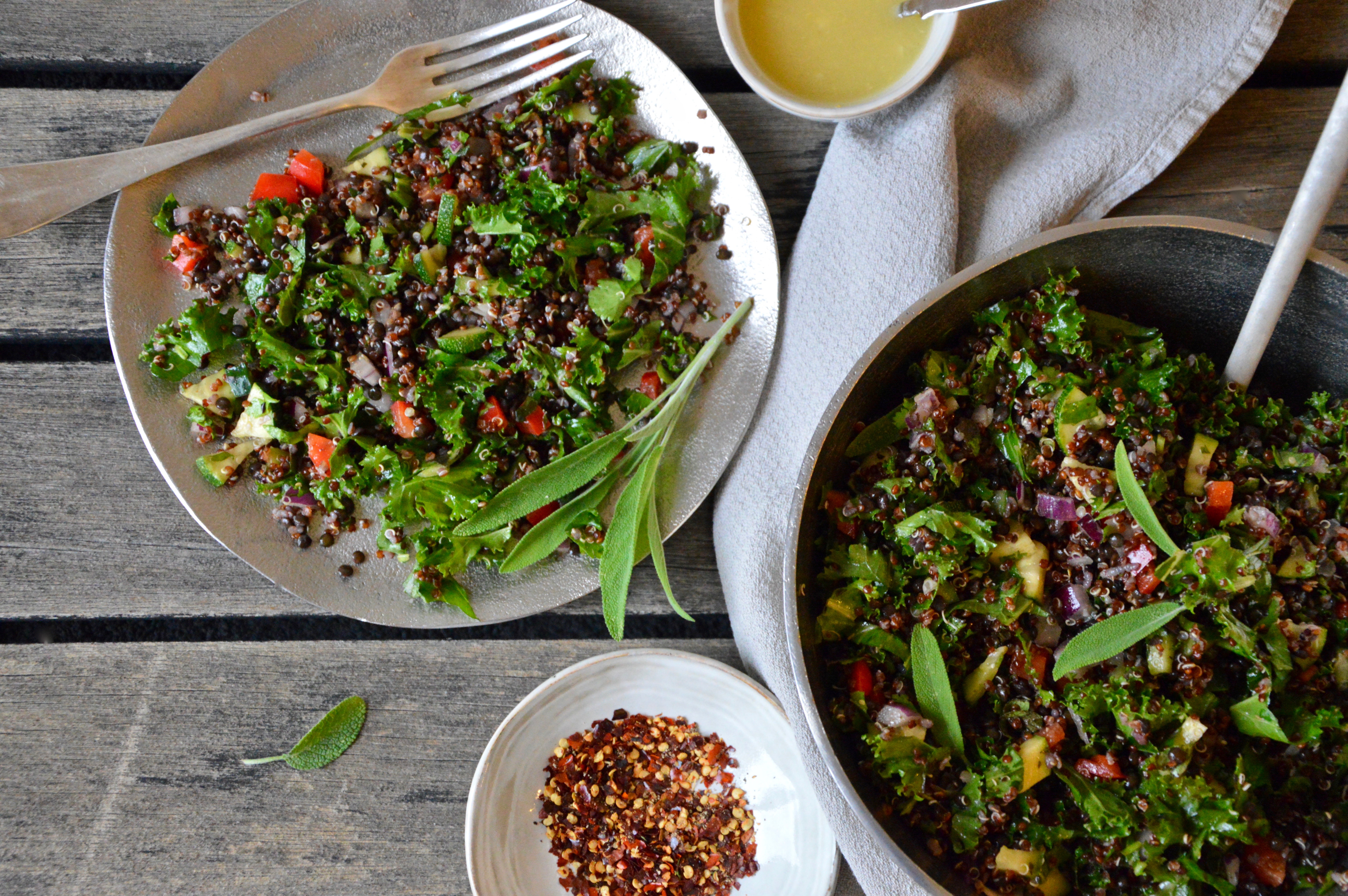 In this recipe, I use curly kale leaves, cooked red quinoa and black beluga lentils. You can also use white or tri-coloured quinoa and green lentils. As for the kale, remove the spines, rinse and spin the leaves and slice them into ribbons. (You can buy bagged curly kale leaves that are pre-chopped, but fresh kale is better.) One or two cups of sliced kale leaves should be enough, but go ahead and add more if you like.
