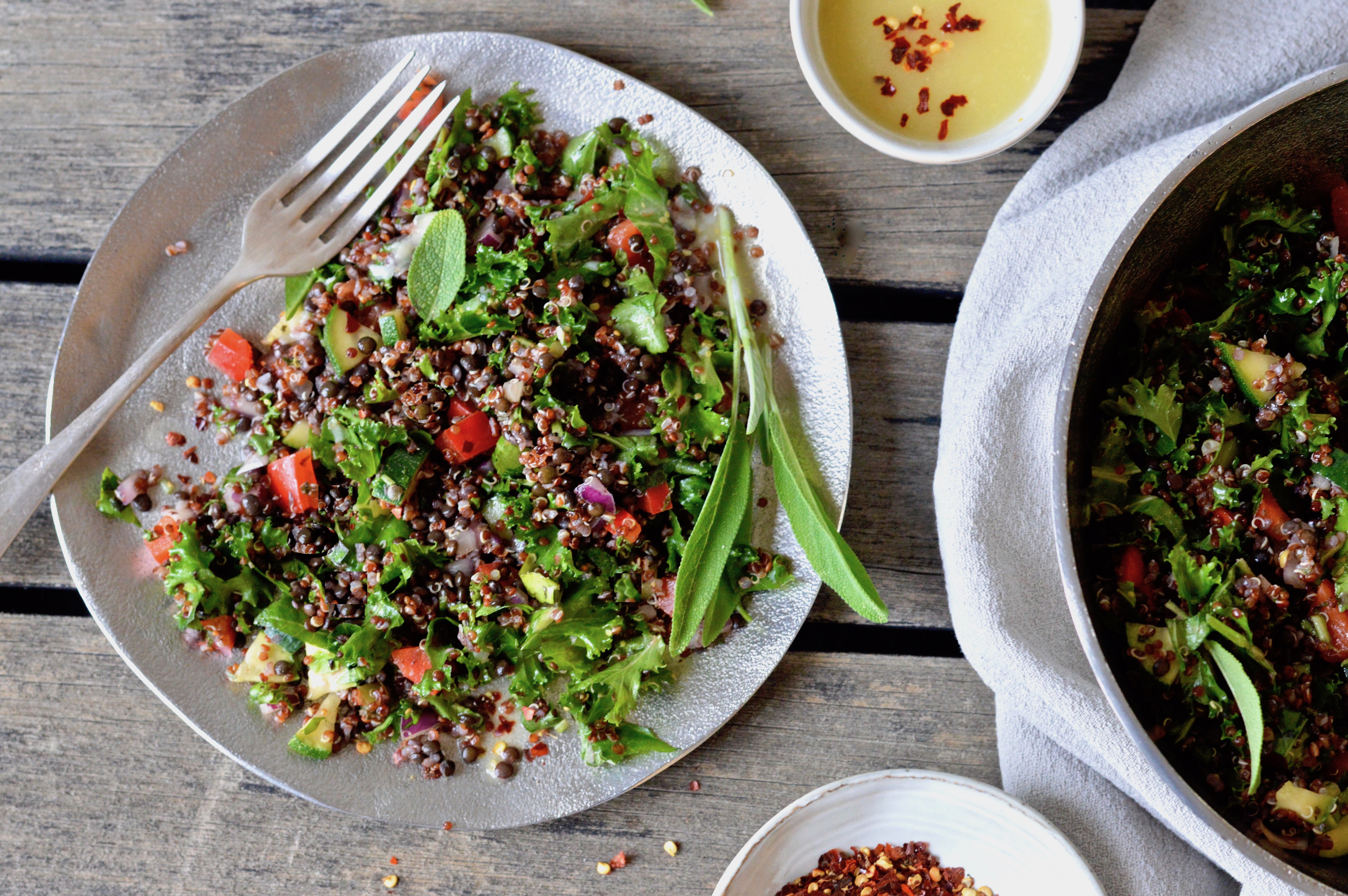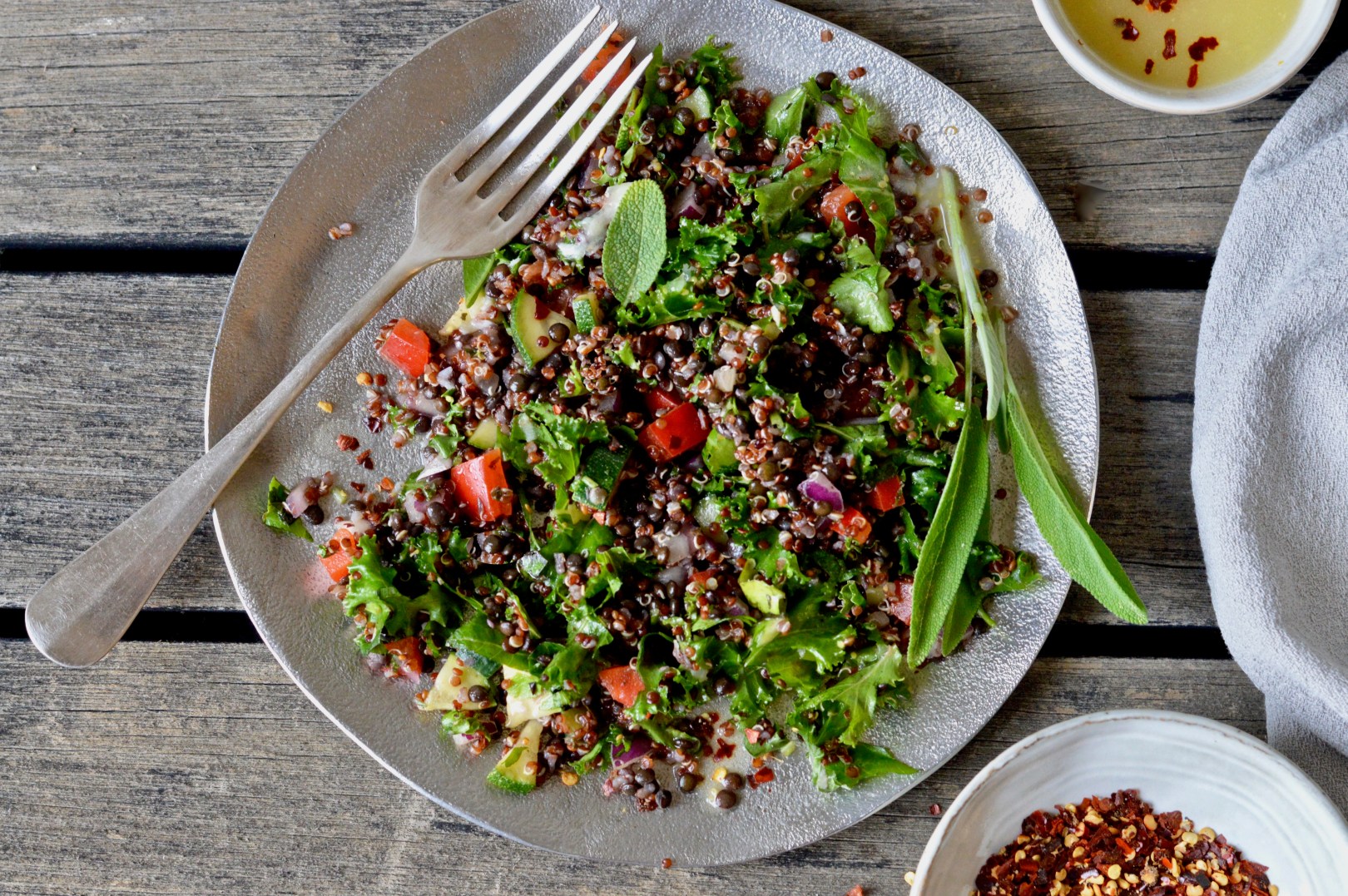 Transfer the cooled quinoa and lentils into the big salad bowl and toss together with the kale and other ingredients. Add a portion of vinaigrette, just enough to evenly moisten and coat all ingredients. Allow the salad to marinate for at least 30 minutes or more, tossing from time to time.