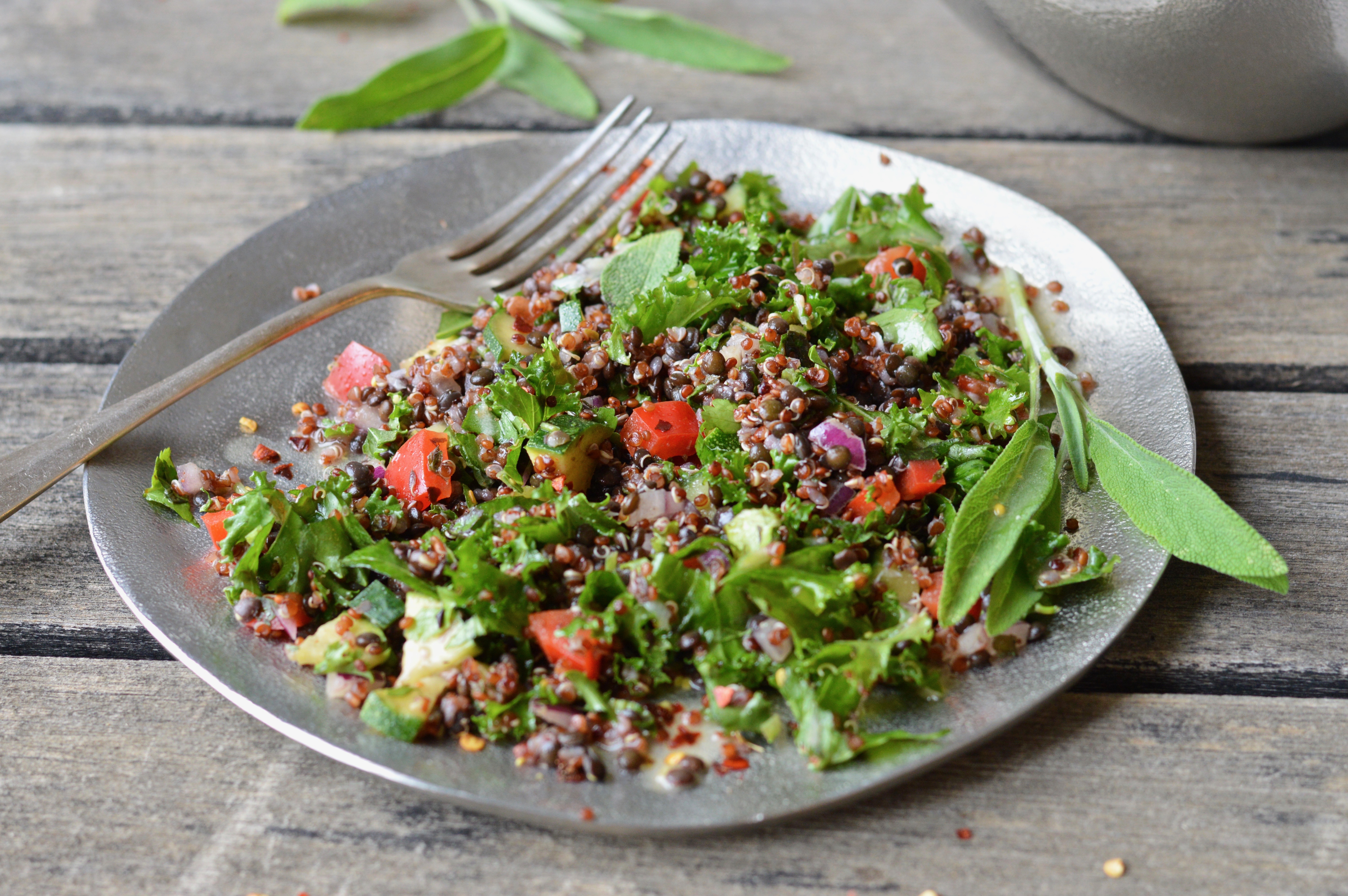 Mix the cooked quinoa and lentils together in a medium-size bowl and allow to cool to room temperature on countertop. From time to time, fluff up with a fork to release steam.