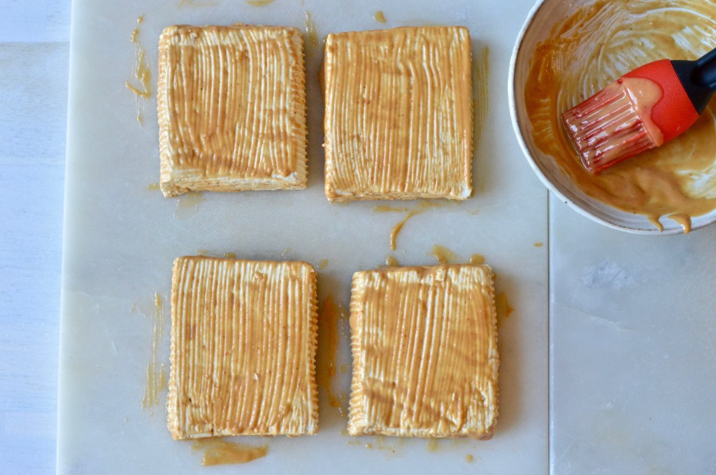 Brush the blocks with mixture on both sides and edges and let stand for 30 minutes (longer for more flavour) in a sealed container in fridge. I like to let marinate for a few hours.