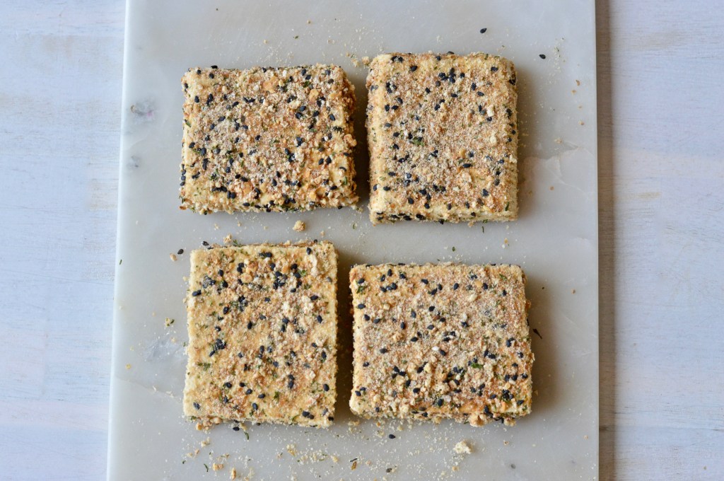 To bread the tofu, add about 2-3 tbsps of breadcrumbs on a flat plate and coat each tofu block with the crumbs on both sides by pressing down with your fingers. Press down to lock the crumbs into the tofu.