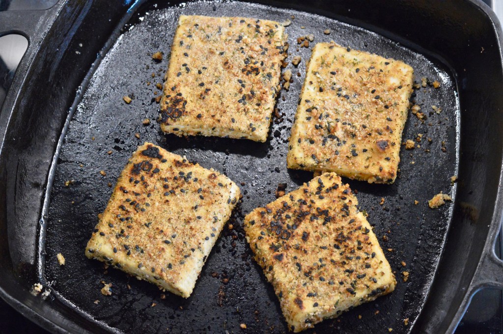 To fry the tofu slices, heat up a non-stick frying pan with some oil. You don’t need much oil, about a few tbsps or just enough to thinly coat the bottom of your pan. Reduce the heat to medium-high. Fry the breaded tofu slices until crispy golden, about 4-5 minutes per side, or until crispy. Adjust or lower the heat if need be. Try and not flip them too often. Use a metal spatula for flipping.