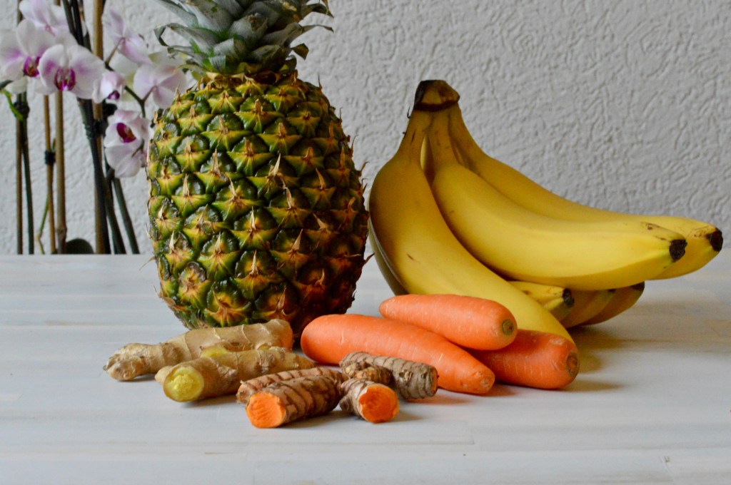 A healthy and delicious smoothie is what you get when you blend fresh pineapple with carrots, banana, ginger and curcuma roots.