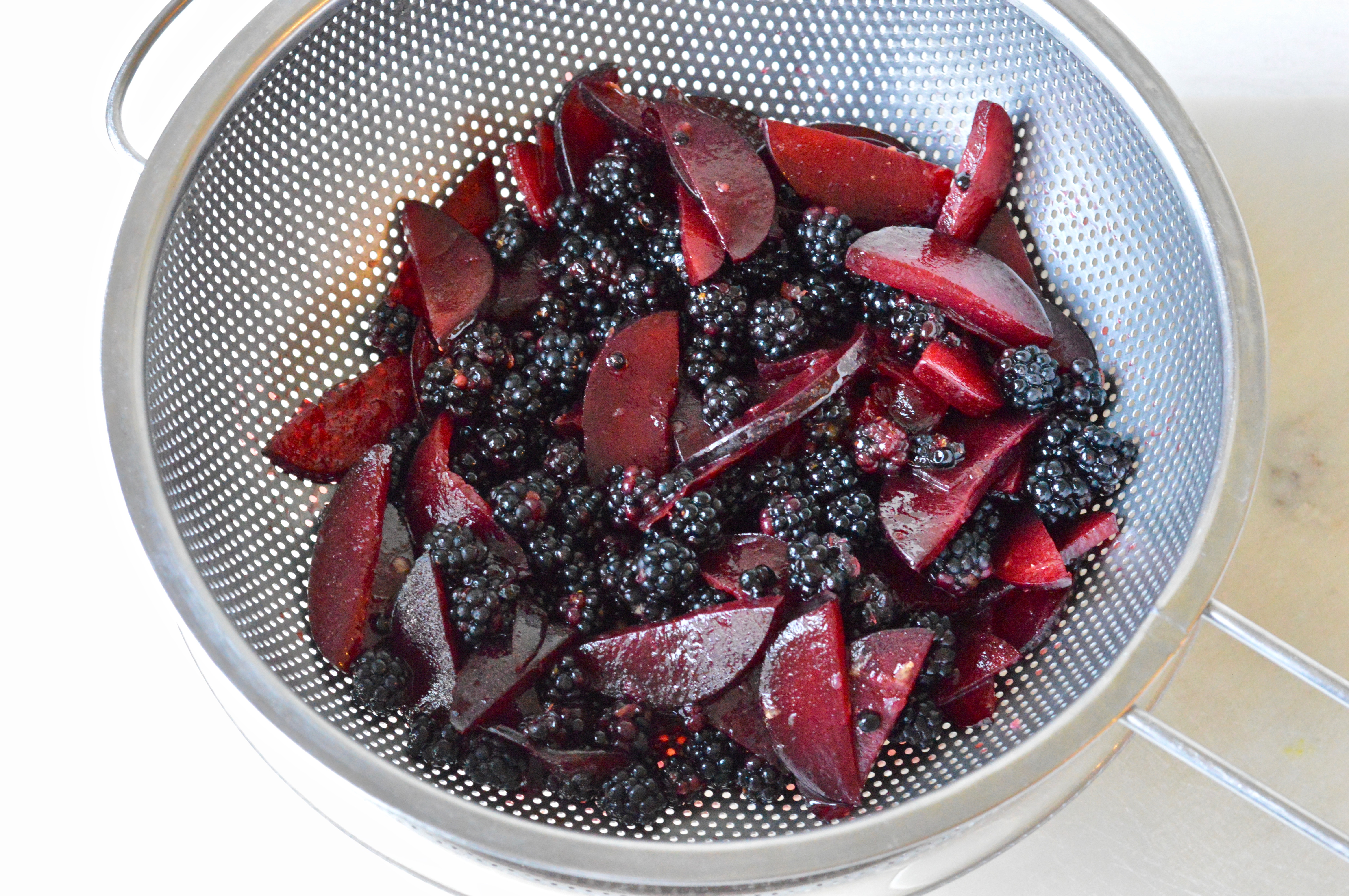Take out the marinating fruit from the fridge and transfer to a sieve supported by a bowl to strain the fruit and collect all of the juice/syrup in the bowl. In the bowl, you will have fruit syrup. Stir the syrup with a fork and set this aside. You will use it later for the glaze.