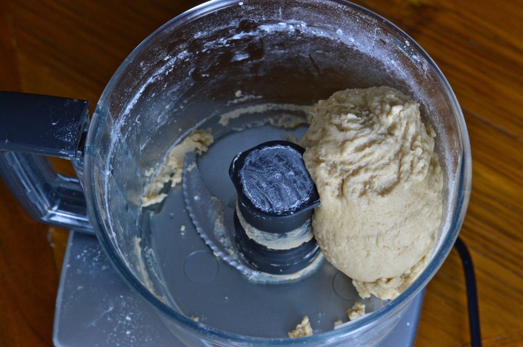 Add 2-4 tbsps of ice water (start with 2 tbsps) and process until a ball forms. If the dough is too moist or creamy, a ball won’t form (this often happens), so just add a bit more spelt flour, starting with 1 tbsp and process for a few seconds and repeat this until a ball forms. Or, if the dough is too dry (this happens less often), add another tbsp of ice water and process. As soon as the dough gathers and forms a ball, your dough is ready.