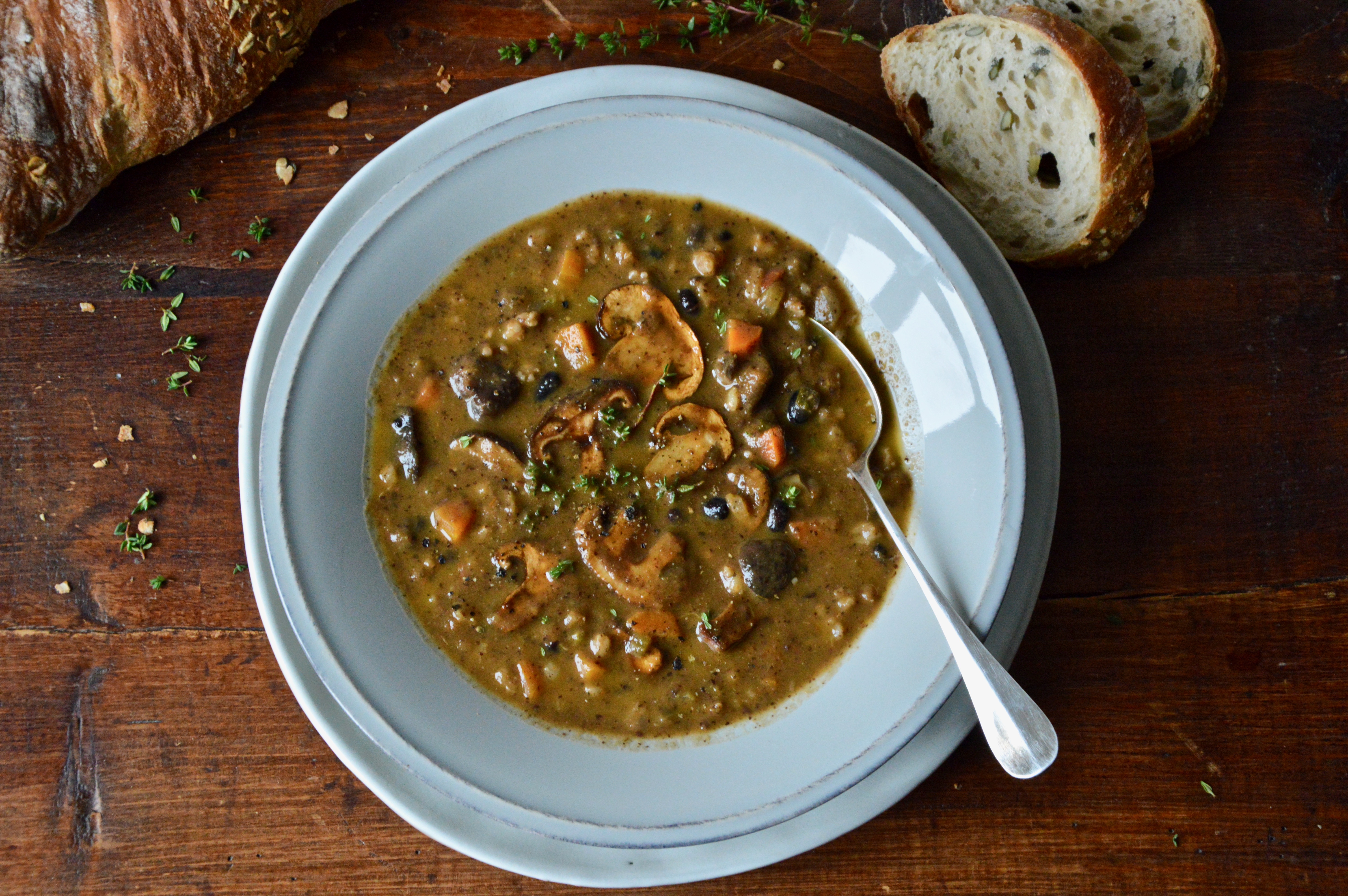 This plant-based soup, which is almost like a stew, is made with mushrooms, black beans, barley and basic vegetables. It is so good! Filled with savoury umami flavours, it is the perfect meatless winter meal in a bowl.