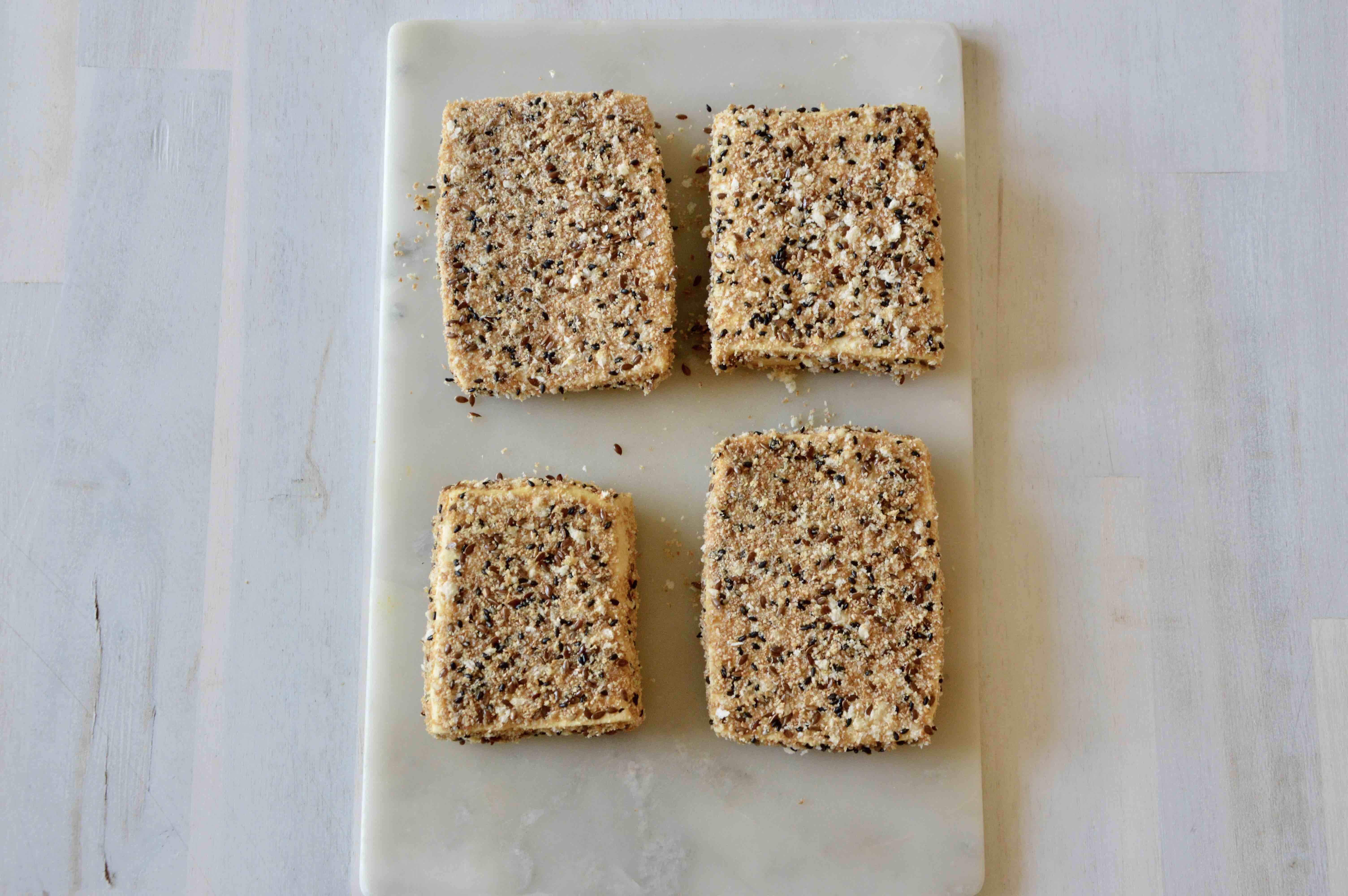 Bread the tofu by adding about 2-3 tbsps of breadcrumbs on a flat plate and coat each tofu block with the crumbs on all sides by pressing down with your fingers. Repeat if using more tofu blocks. Press down with hands to lock the crumbs into the tofu.