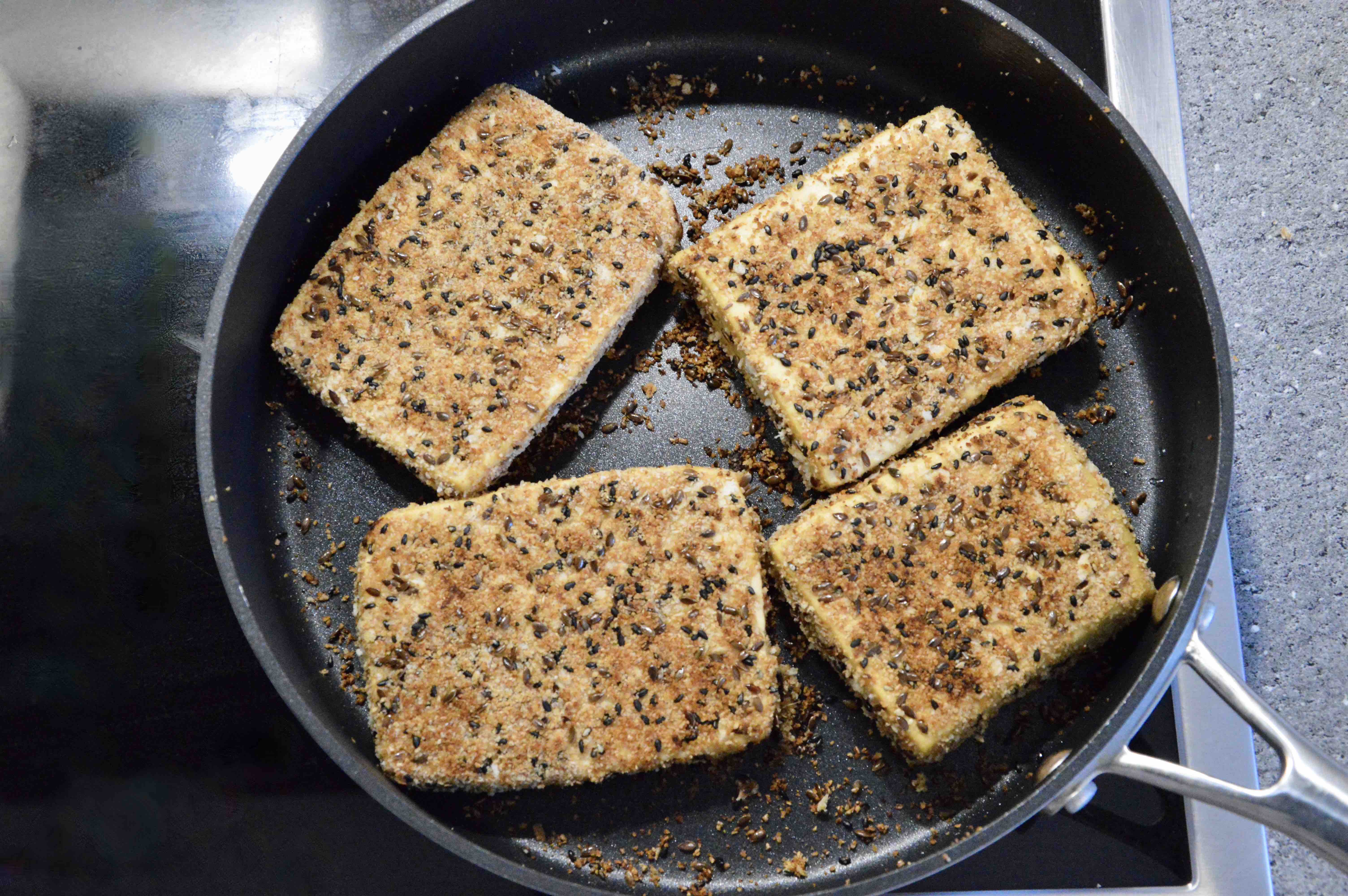 Fry the tofu by heating up a non-stick frying pan with a small amount of oil. You don’t need much oil, about several tbsps or just enough to brush the bottom of your pan. Reduce the heat to medium-high. Fry the breaded tofu slices, about 5 minutes per side, or until crispy golden. Adjust the heat if need be. Try and not flip them too often. Use a metal spatula for flipping.