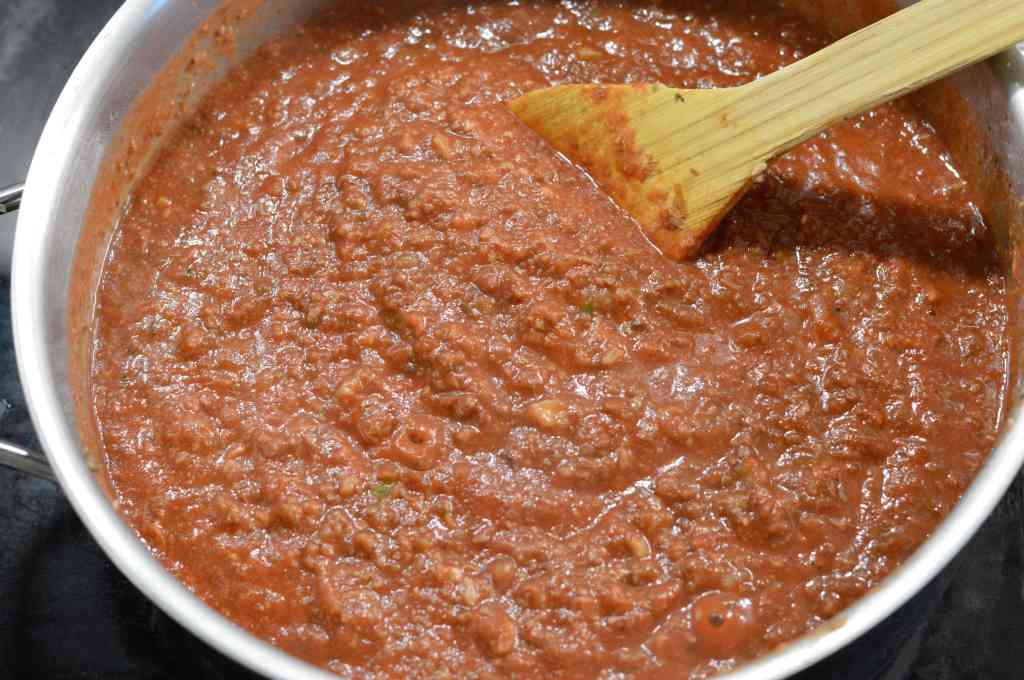 9. After 8-10 minutes of cooking, add the white wine and stir. Adjust or lower heat. Add the tomato sauce and mix. Bring to a boil and immediately reduce to a gentle boil. Keep mixing. Add 1 cup of water into the tomato sauce bottle and give it shake to gather any leftover tomato sauce in it. Pour about 1/2 cup of that water into the sauce and mix. Add the tomato paste and the nutritional yeast. Mix well, adjust heat to maintain a gentle boil. Add an extra 1/2 cup of water, if need be. Mix well.