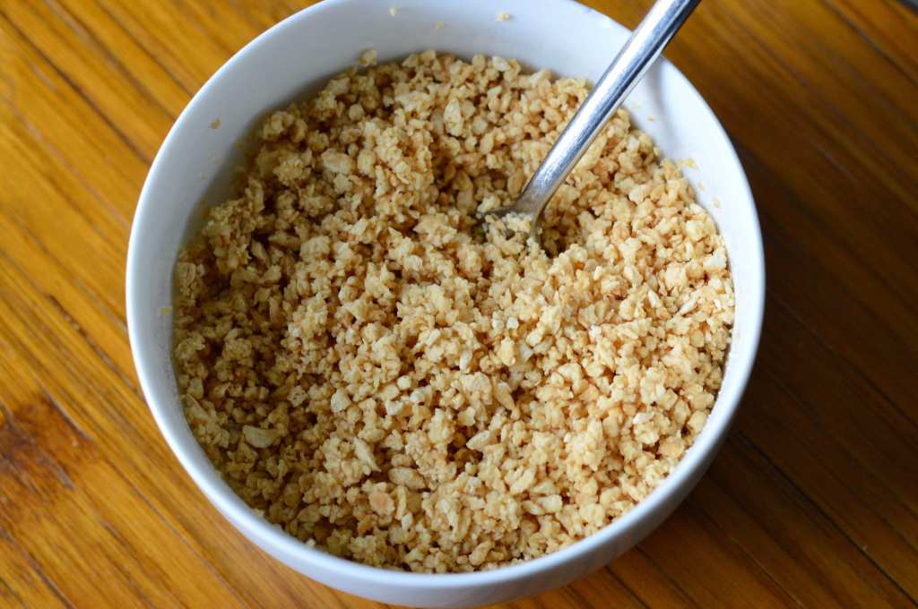 4. In a small bowl, add the one cup of TVP granules. Add 1/4 cup of boiled water to the TVP and fluff it up with a fork to hydrate the granules.