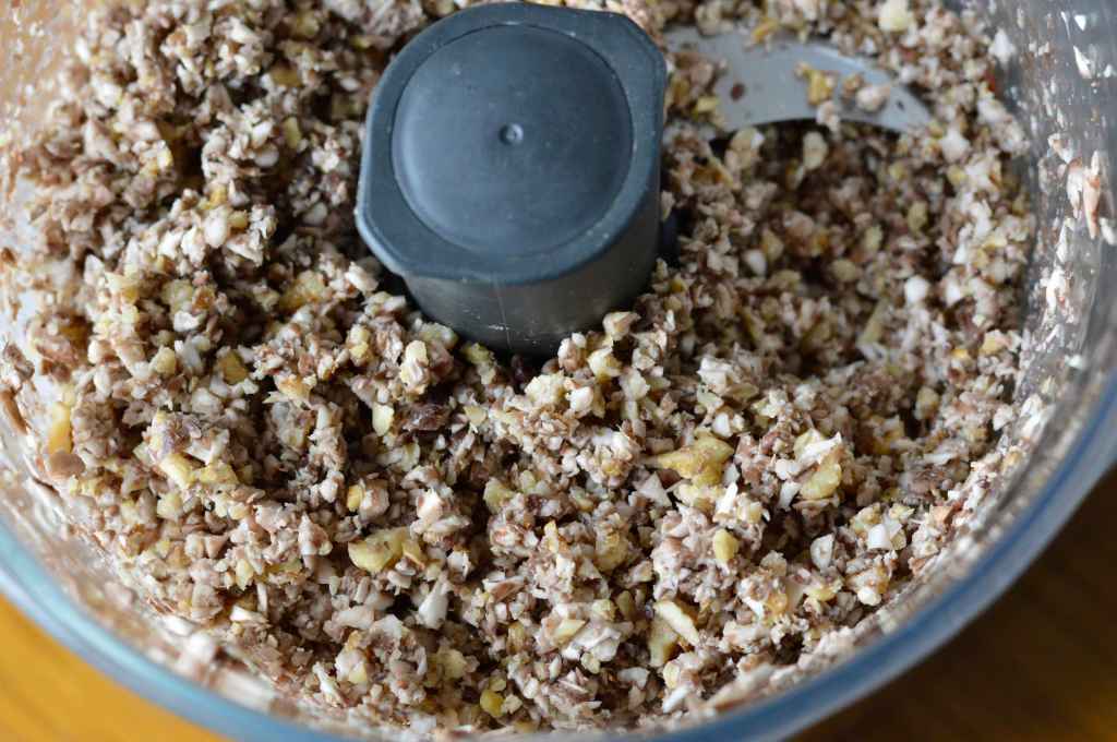 2. Transfer the walnuts and chopped mushrooms into the bowl of your food processor and pulse a few times in increments of a few seconds to obtain course pieces.