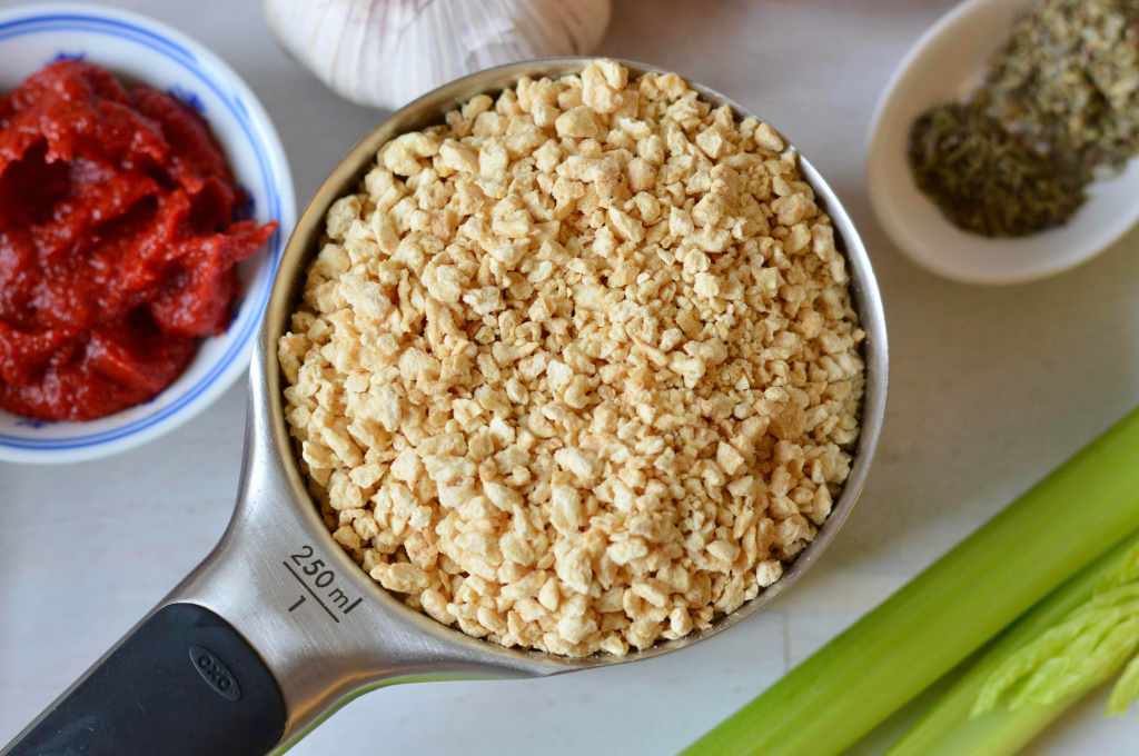 - 1 cup dry TVP granules (Textured Vegetable Protein) + 1/4 cup boiling water to hydrate