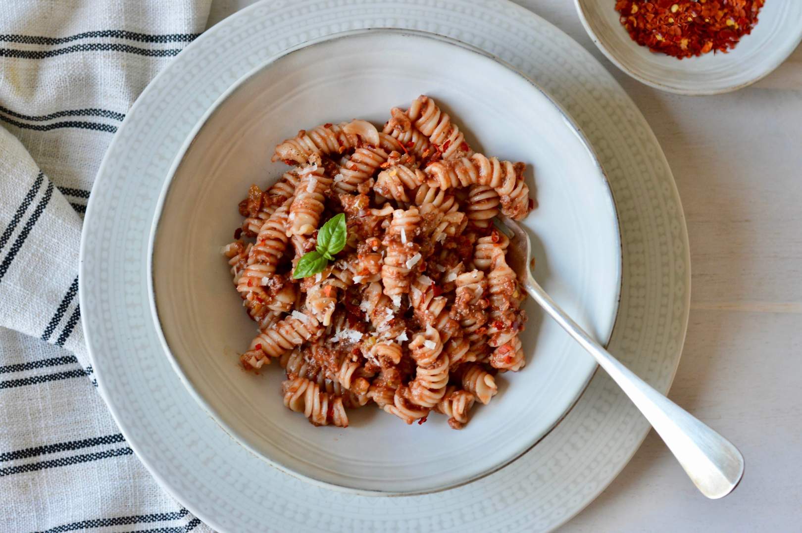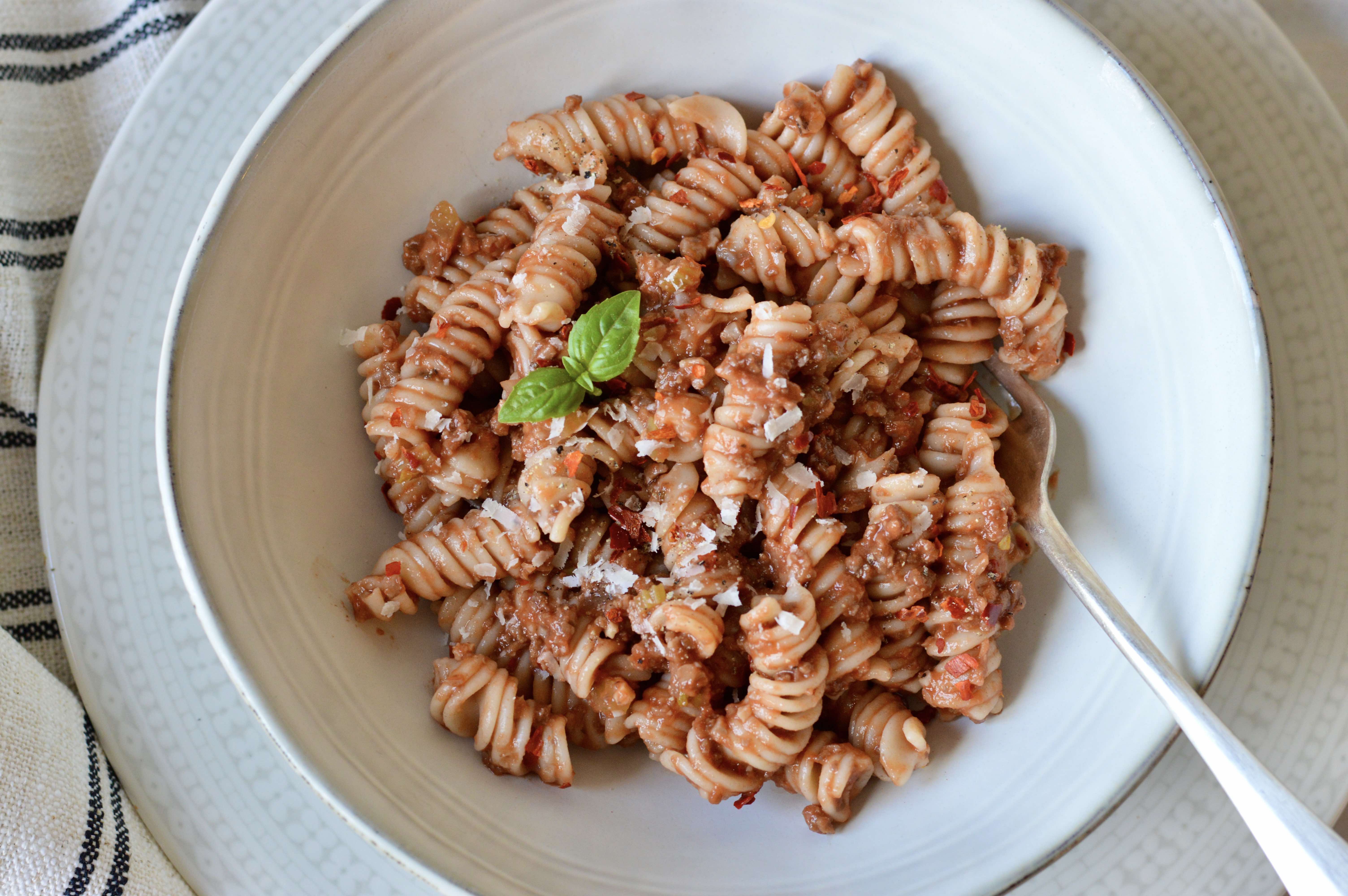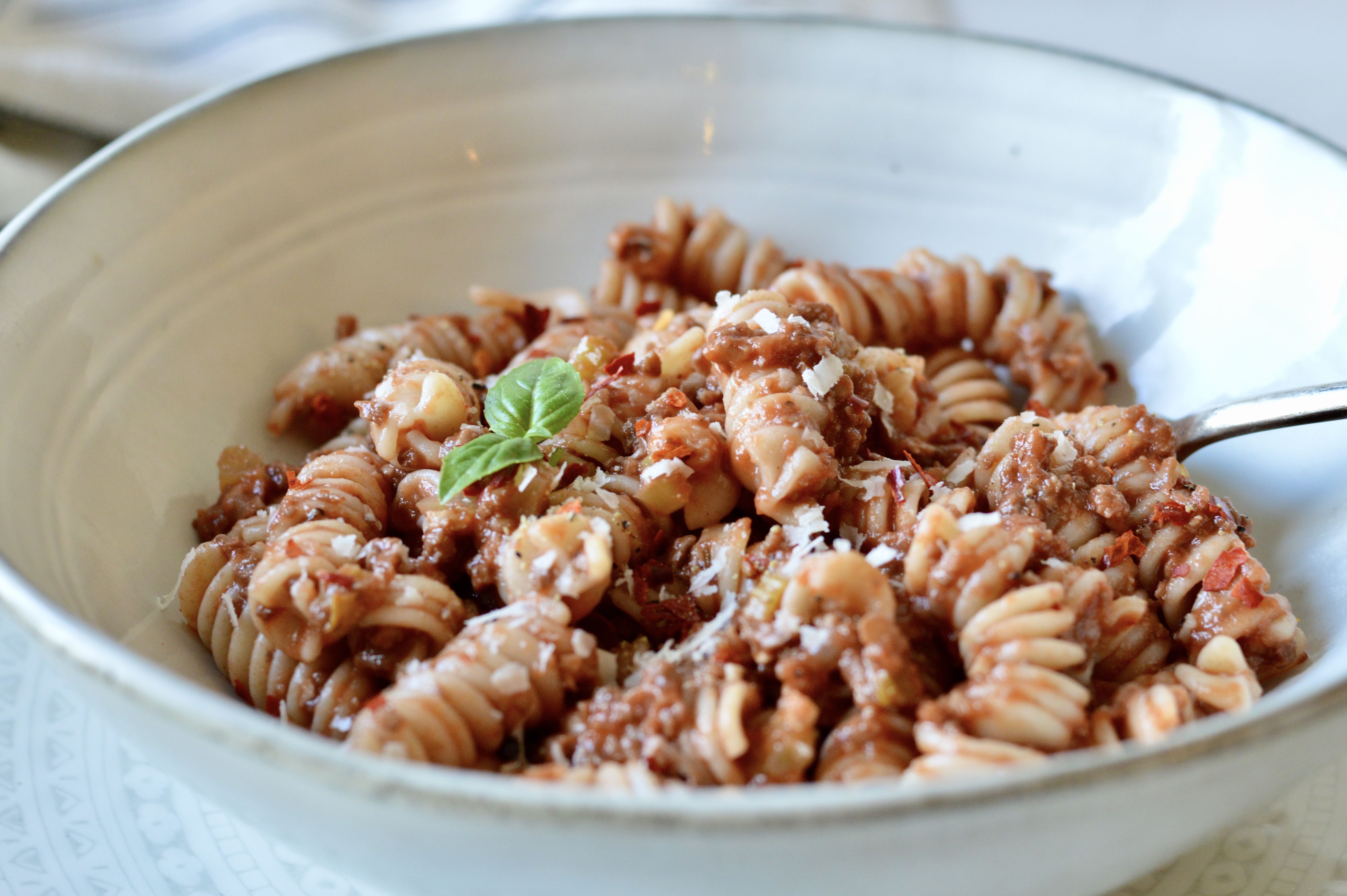 Easy, tasty, healthy, this Bolognese sauce has all the love and flavour of Italy without the meat! My husband prefers the real beef-made Bolognese sauce, but he gave me the BIG thumbs-up for this one. 👍