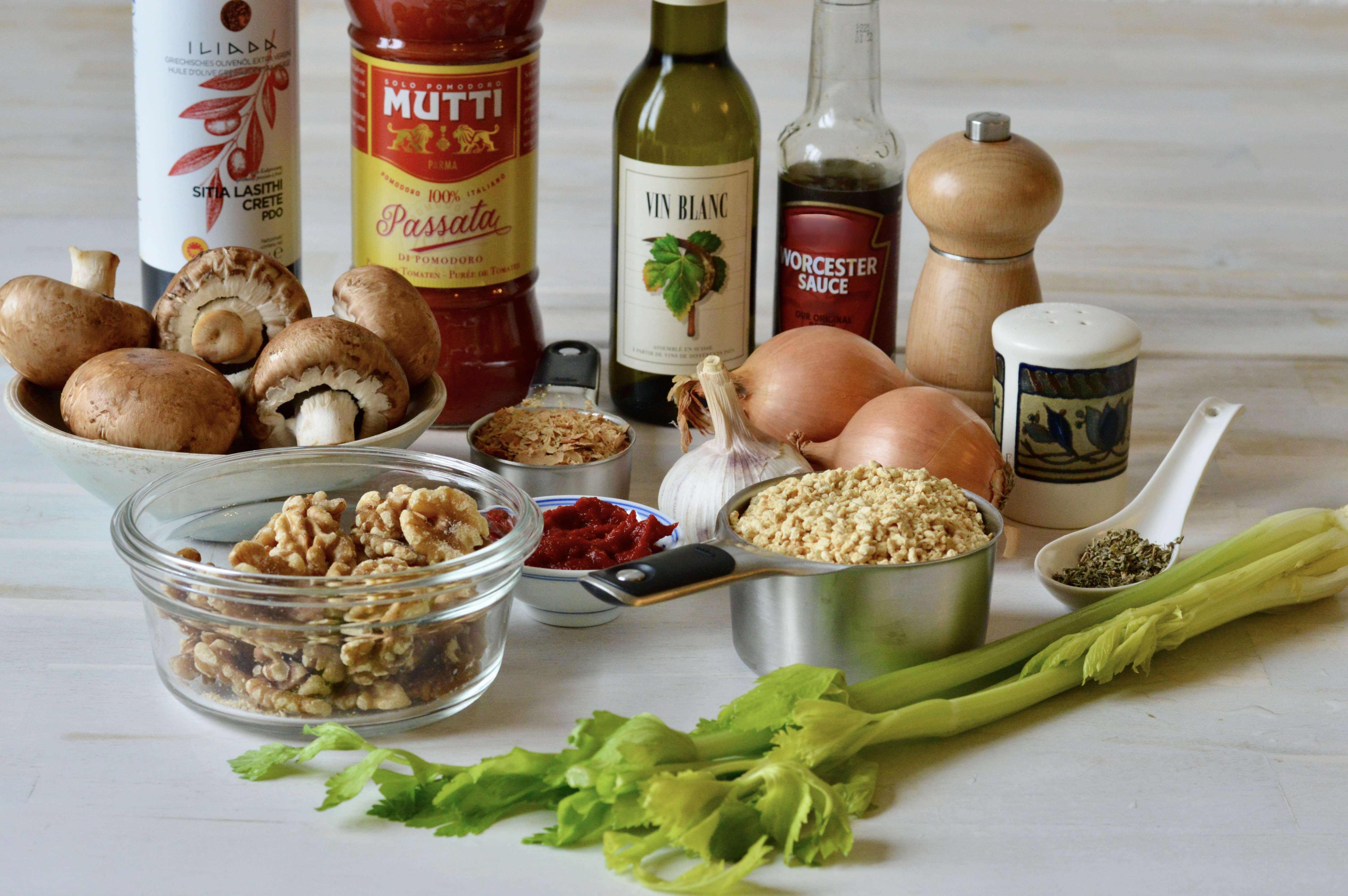 So, I scratched the lentils and decided to give the sauce a more authentic “Bolognese” taste and texture by mixing together the TVP granules with walnuts and chopped mushrooms—often the main ingredients in the making of veggie burgers.