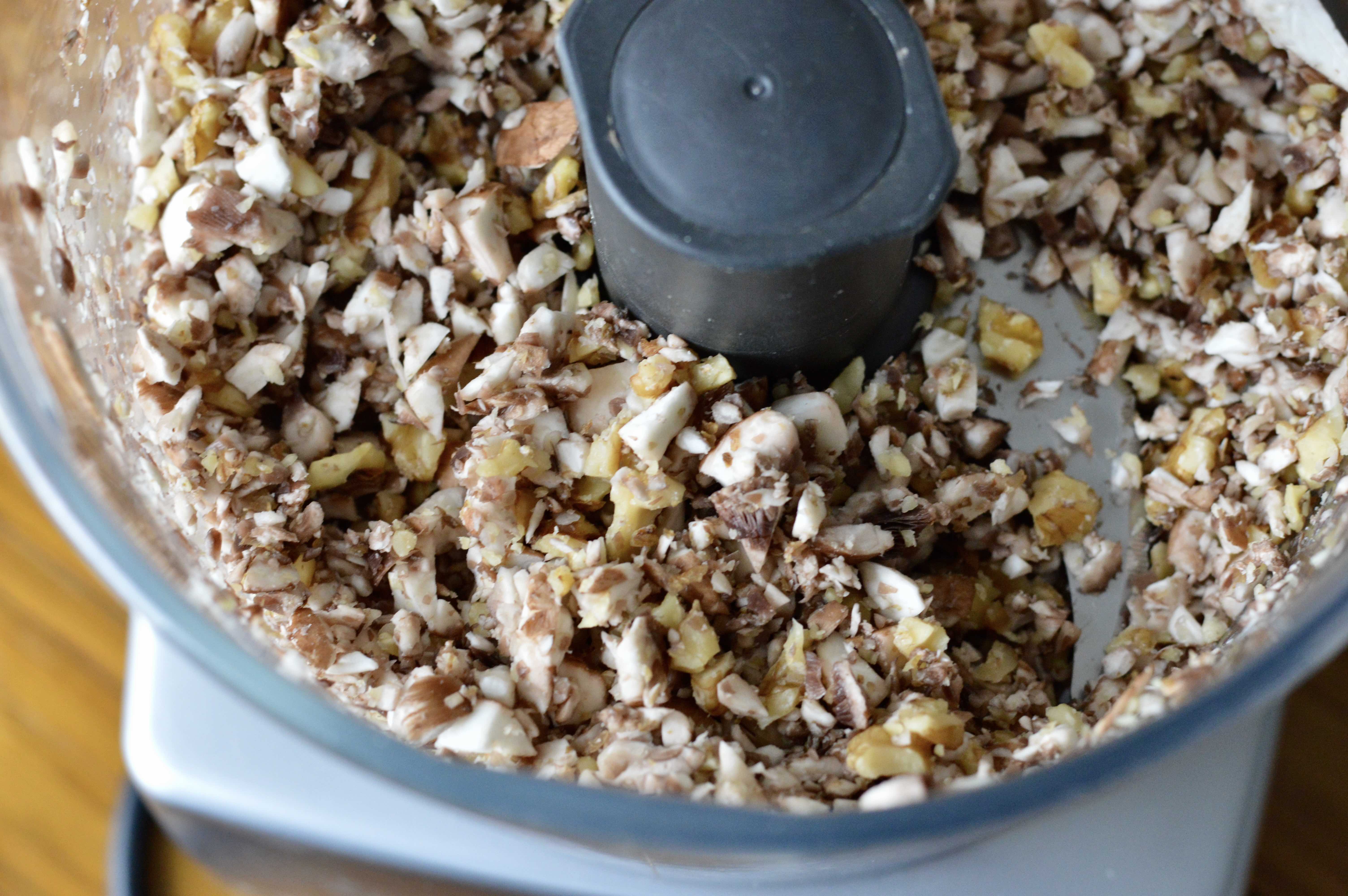 2. Transfer the walnuts and chopped mushrooms into the bowl of your food processor and pulse a few times in increments of a few seconds to obtain course pieces.