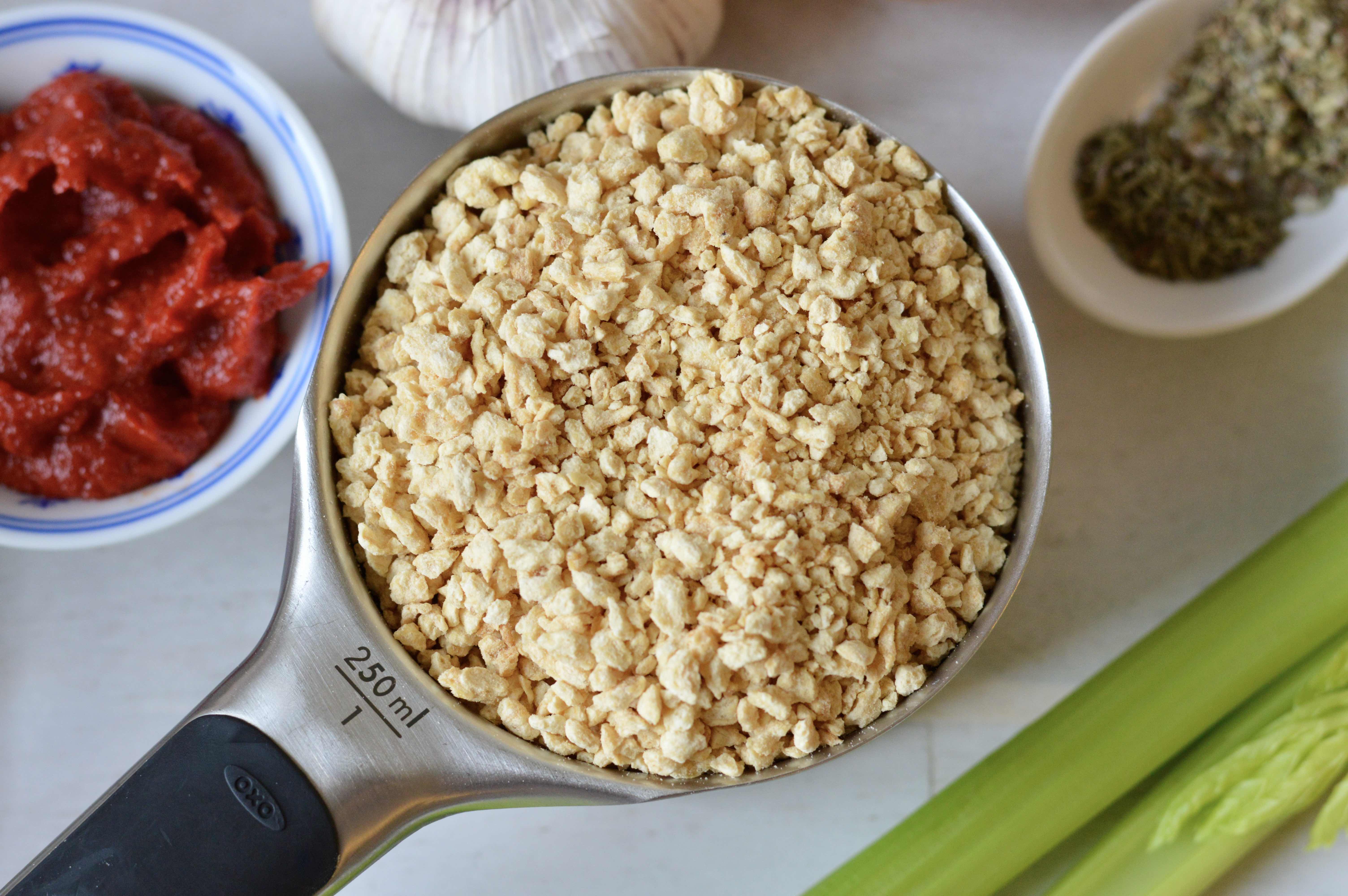 - 1 cup dry TVP granules (Textured Vegetable Protein) + 1/4 cup boiling water to hydrate