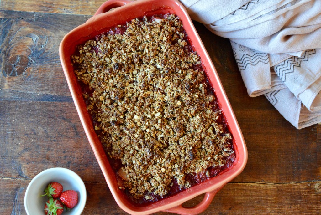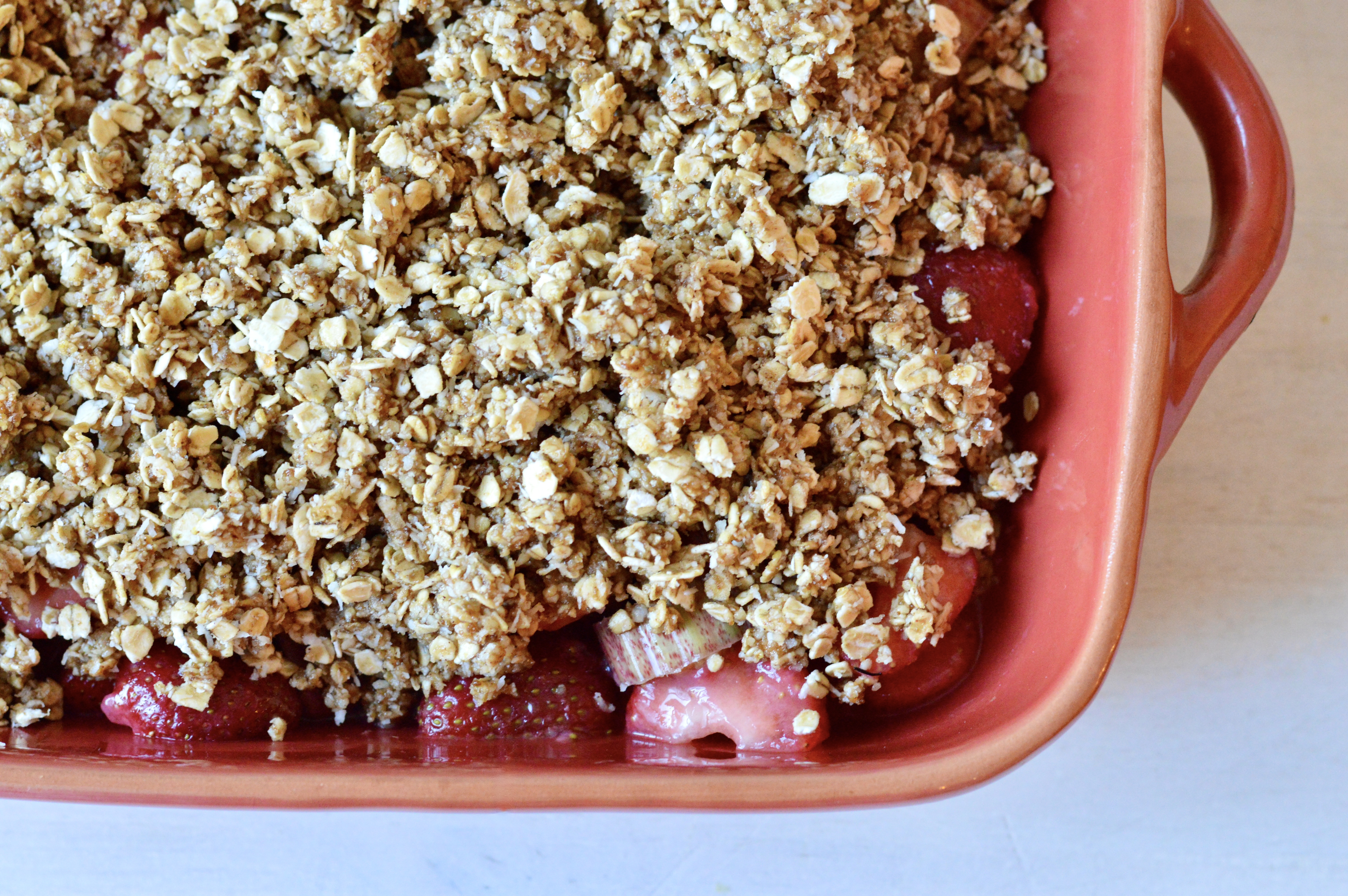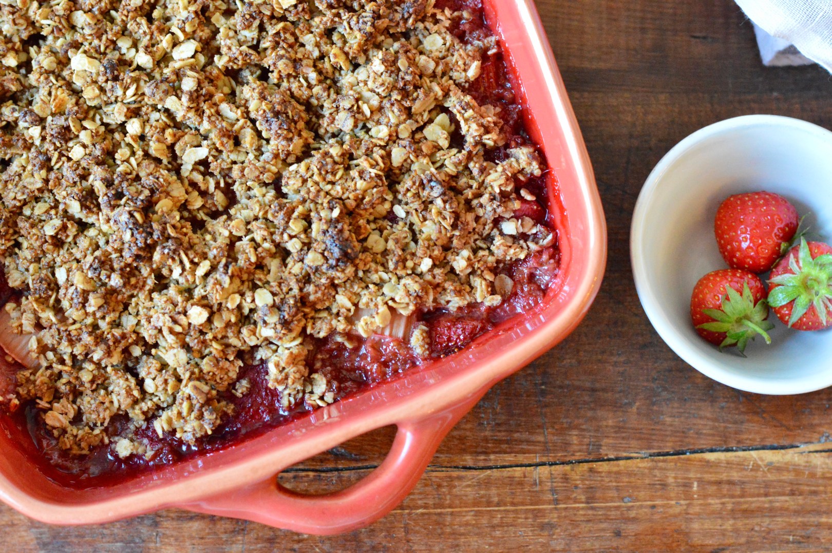 If you have a bunch of fresh rhubarb and strawberries, why not make something easy and healthy like a crumble? You can’t go wrong pairing rhubarb with strawberries; they are the perfect combo.