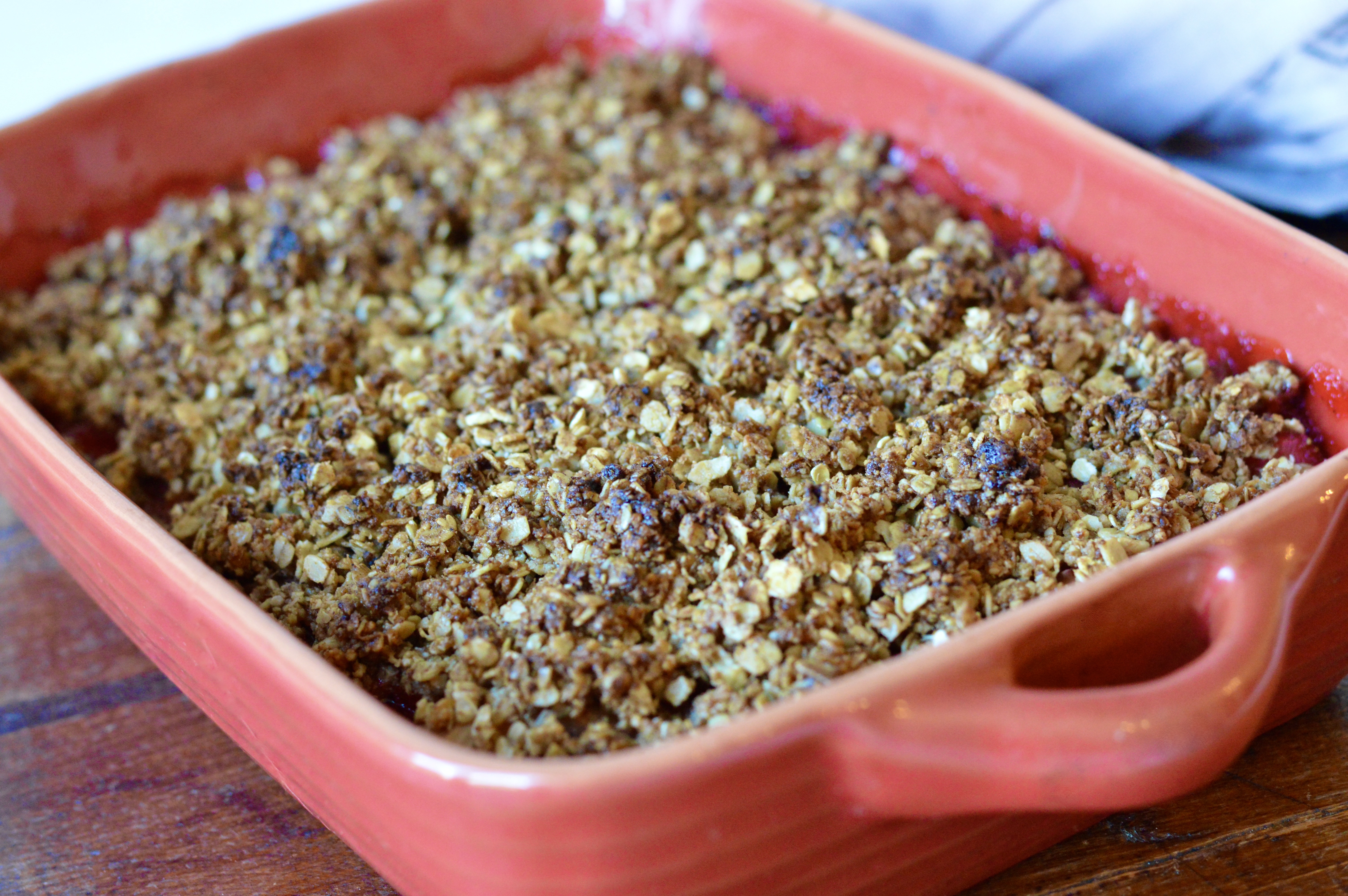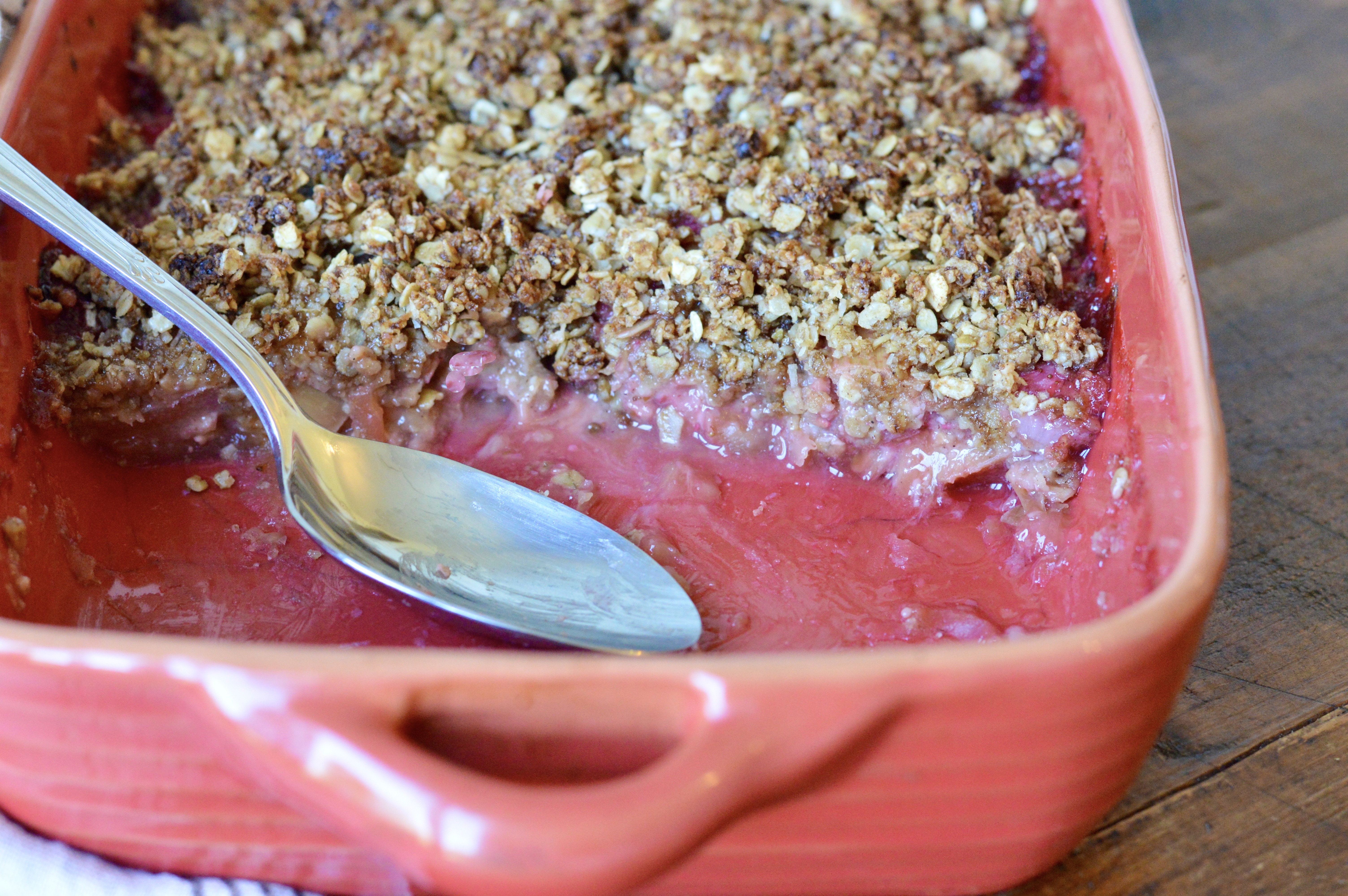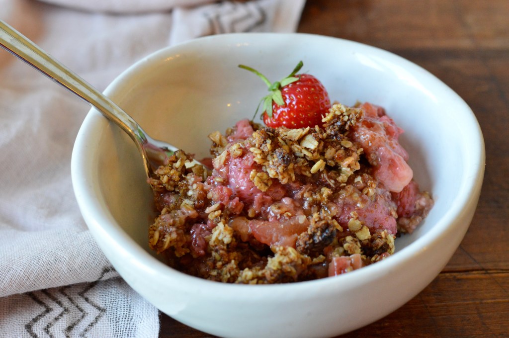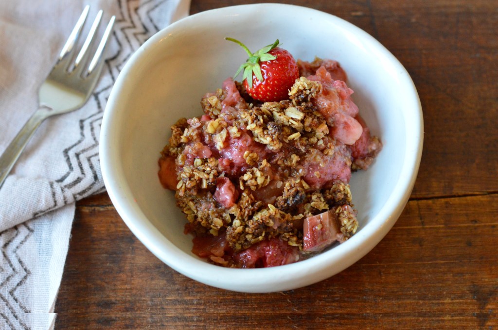 If you have a bunch of fresh rhubarb and strawberries, why not make something easy and healthy like a crumble? You can’t go wrong pairing rhubarb with strawberries; they are the perfect combo.