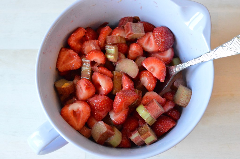 1. Slice the strawberries and rhubarb and place in a medium-size bowl.