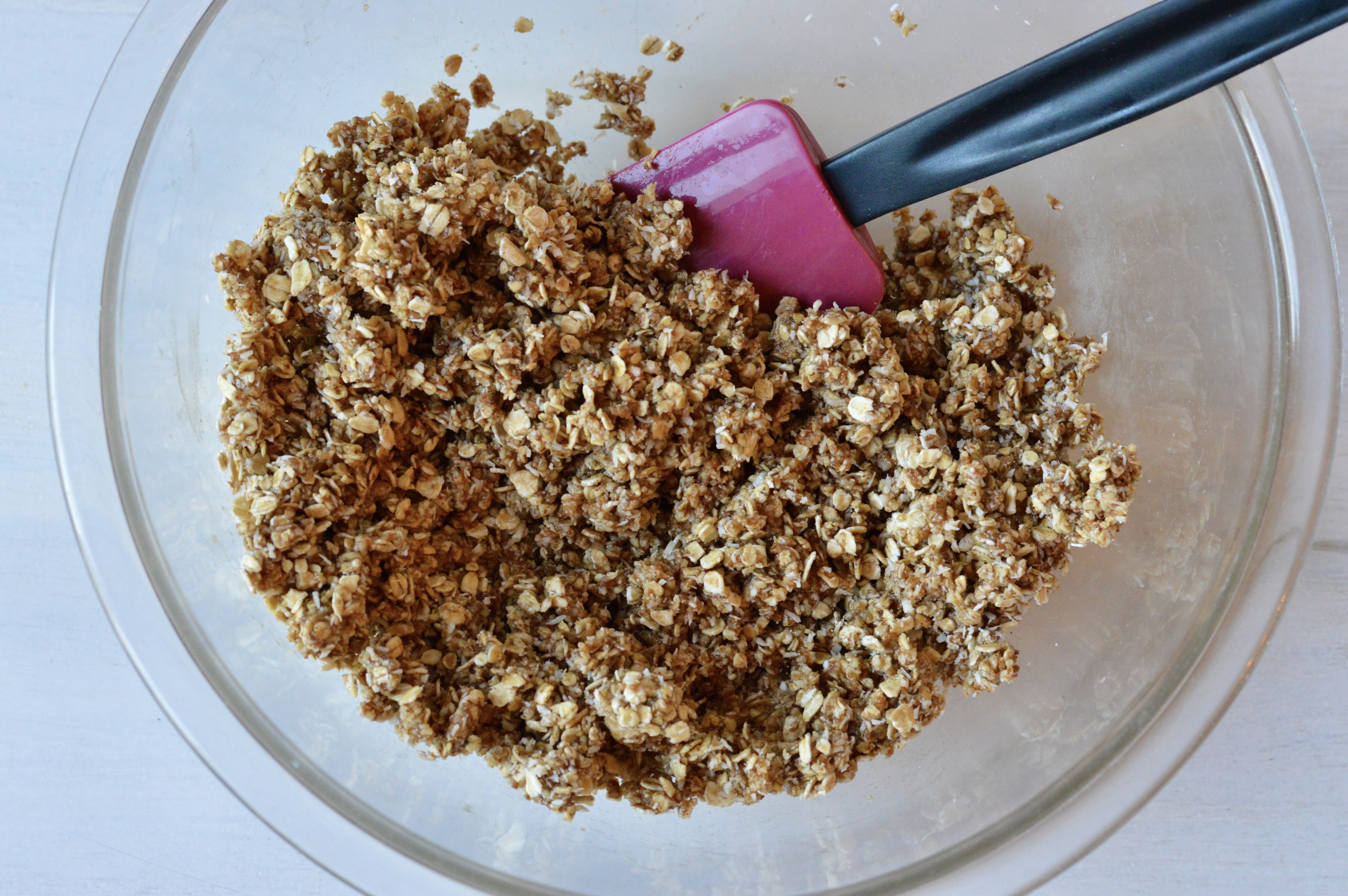4. Transfer the crumbly mixture into a bowl and add the second 1/2 cup of rolled oats and coconut. Mix this with a spatula until combined.
