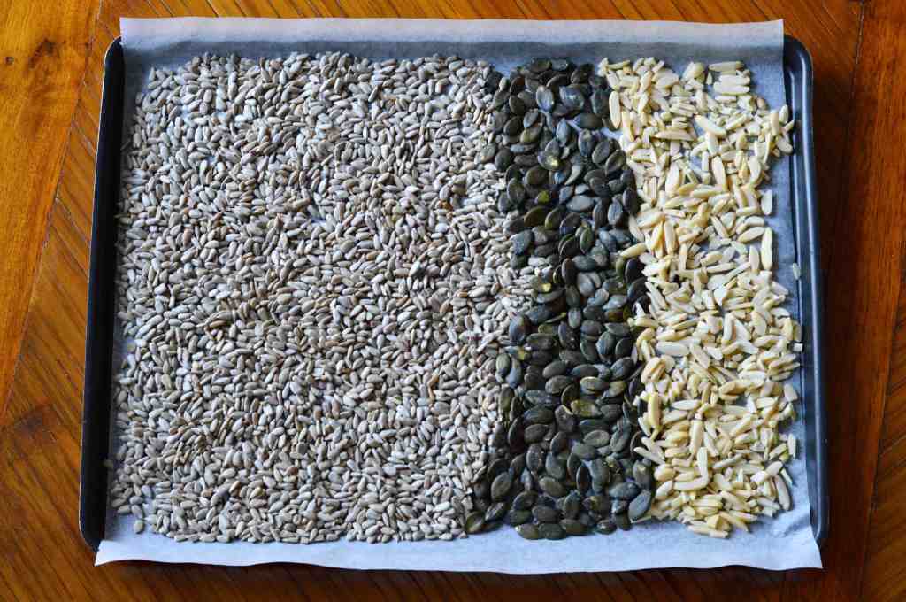 - Set oven at 350°F/180°C. On a lined baking sheet, spread the sunflower seeds, pumpkin seeds and almonds (or chopped hazelnuts) and roast in preheated oven on middle rack for 7-9 minutes.