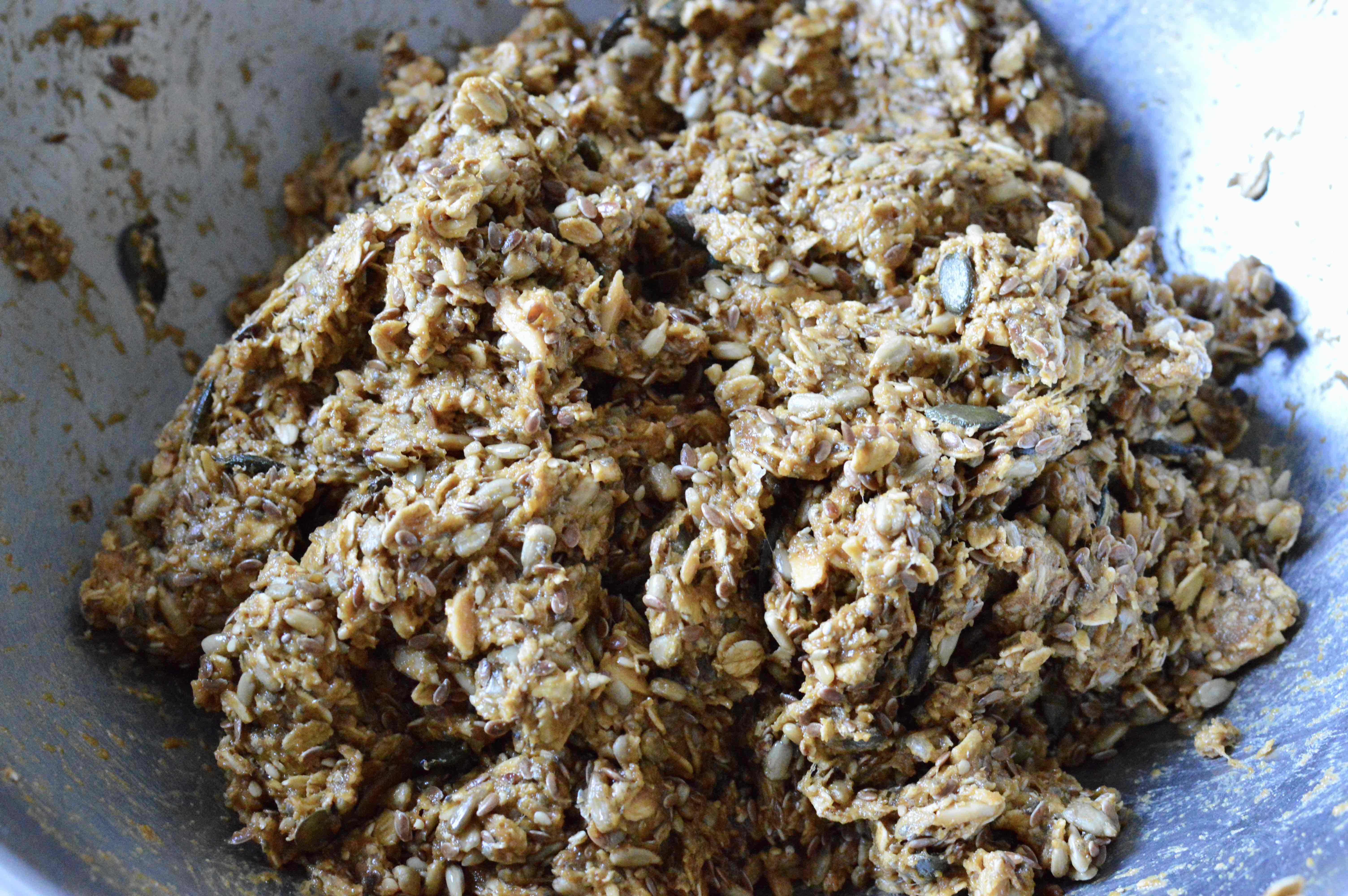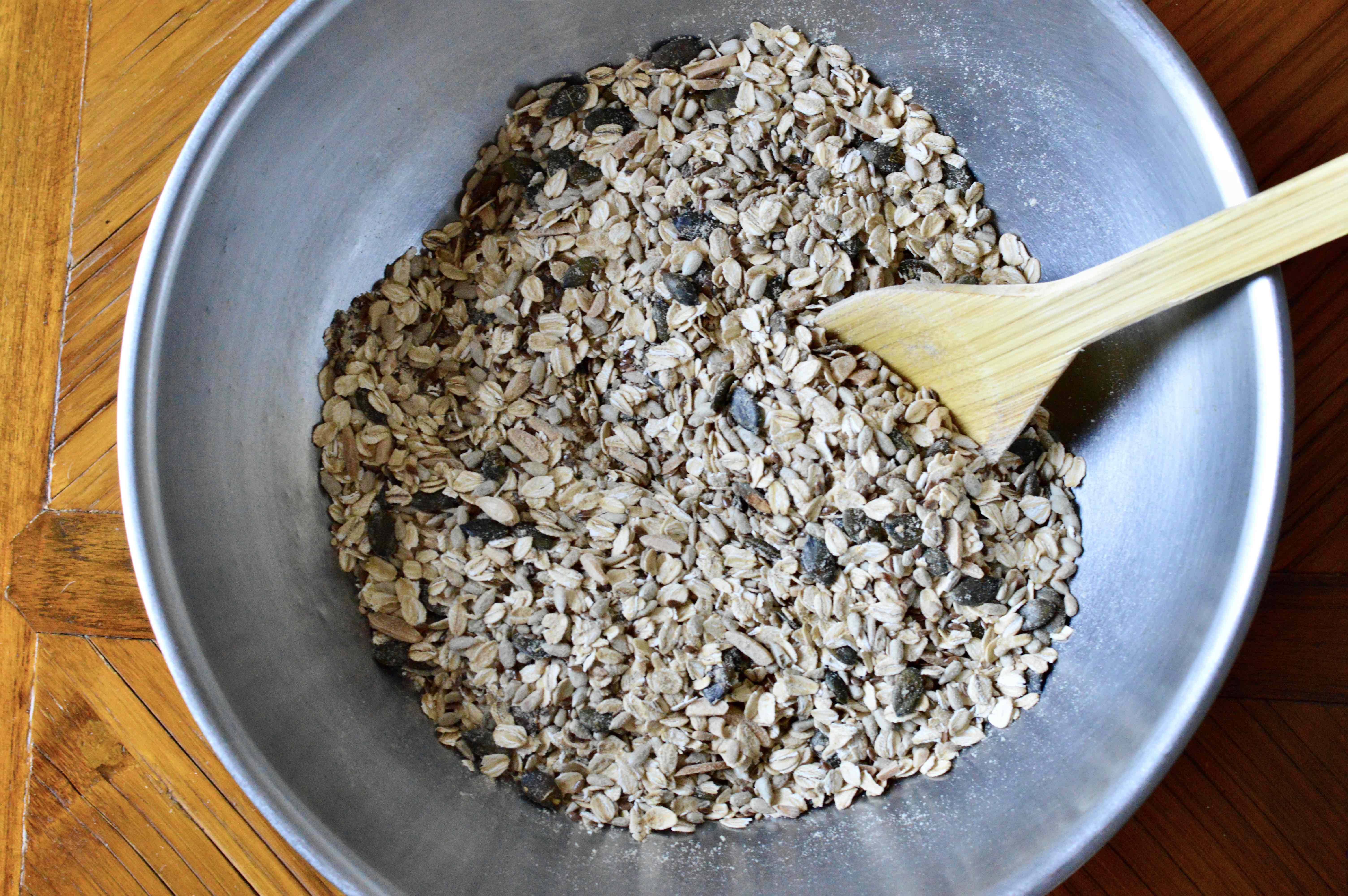 2. Meanwhile, in a big bowl, mix together with wooden spoon the oats, flax, chia and sesame seeds, psyllium husk powder and salt.