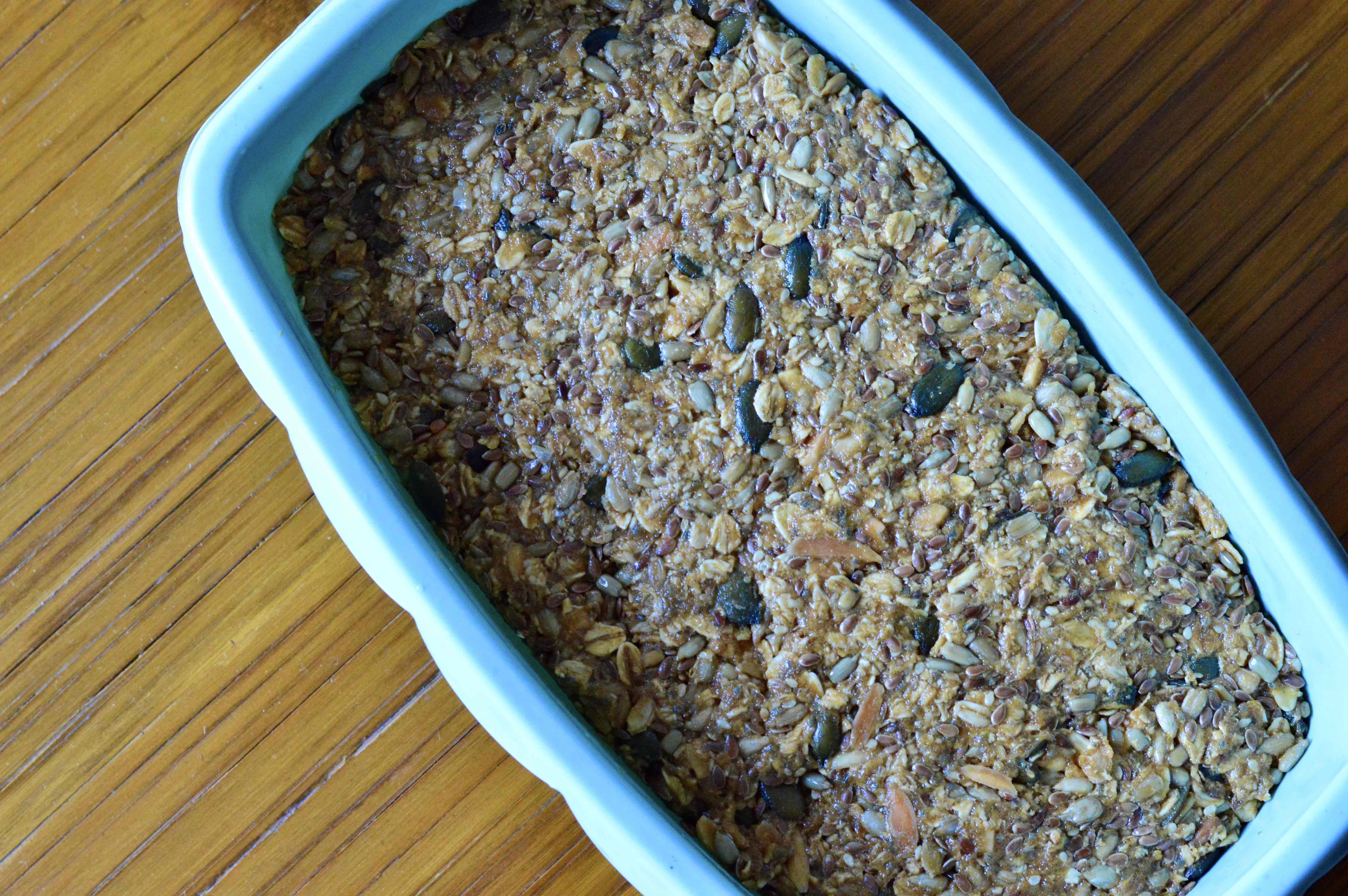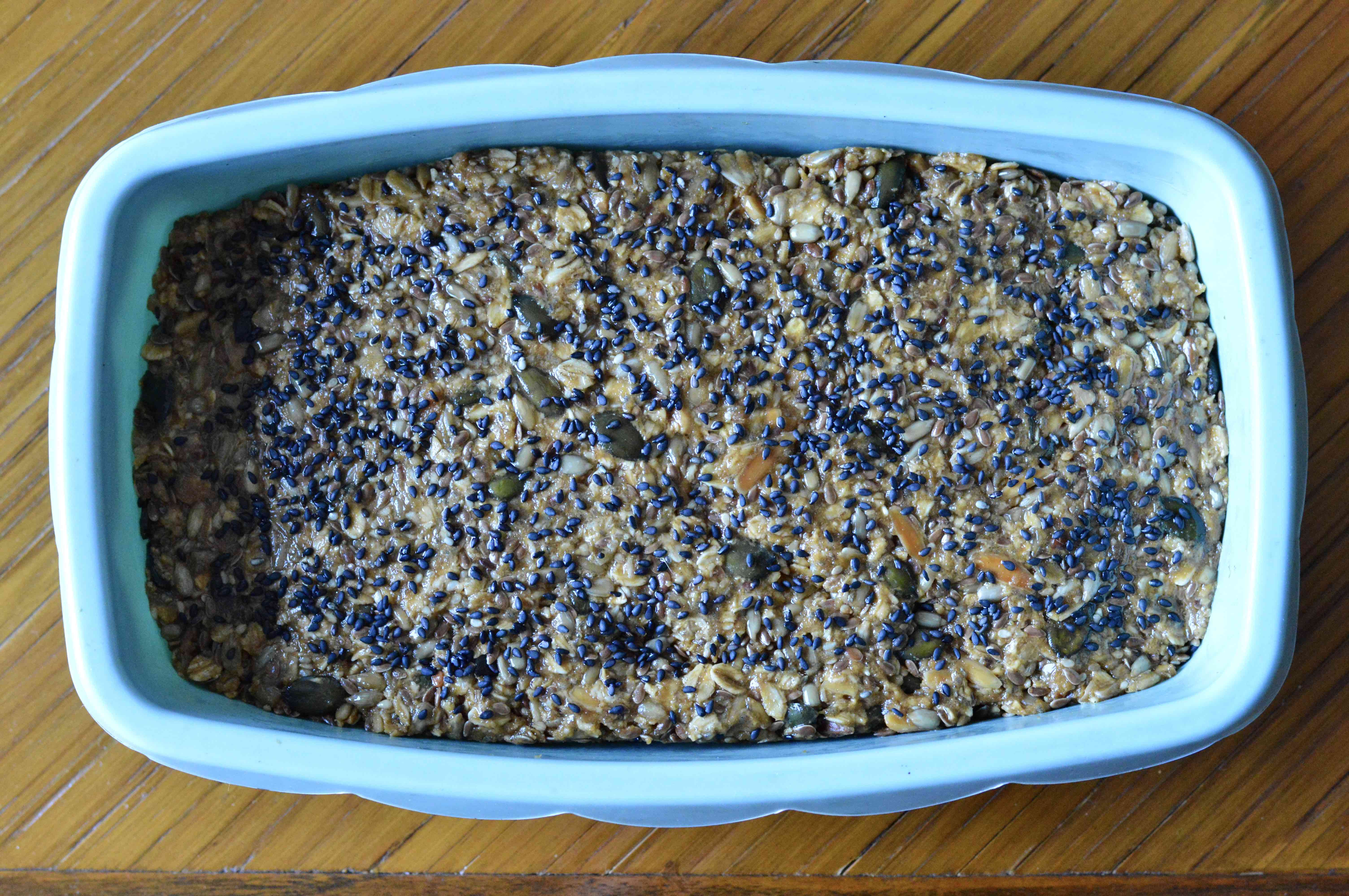 6. Transfer the mixture into the loaf pan lined with parchment (if not using a silicone pan). Pat down tight and smooth the surface with wet fingers or the back of a spoon. Brush top with a bit of olive oil and sprinkle with sesame seeds.
