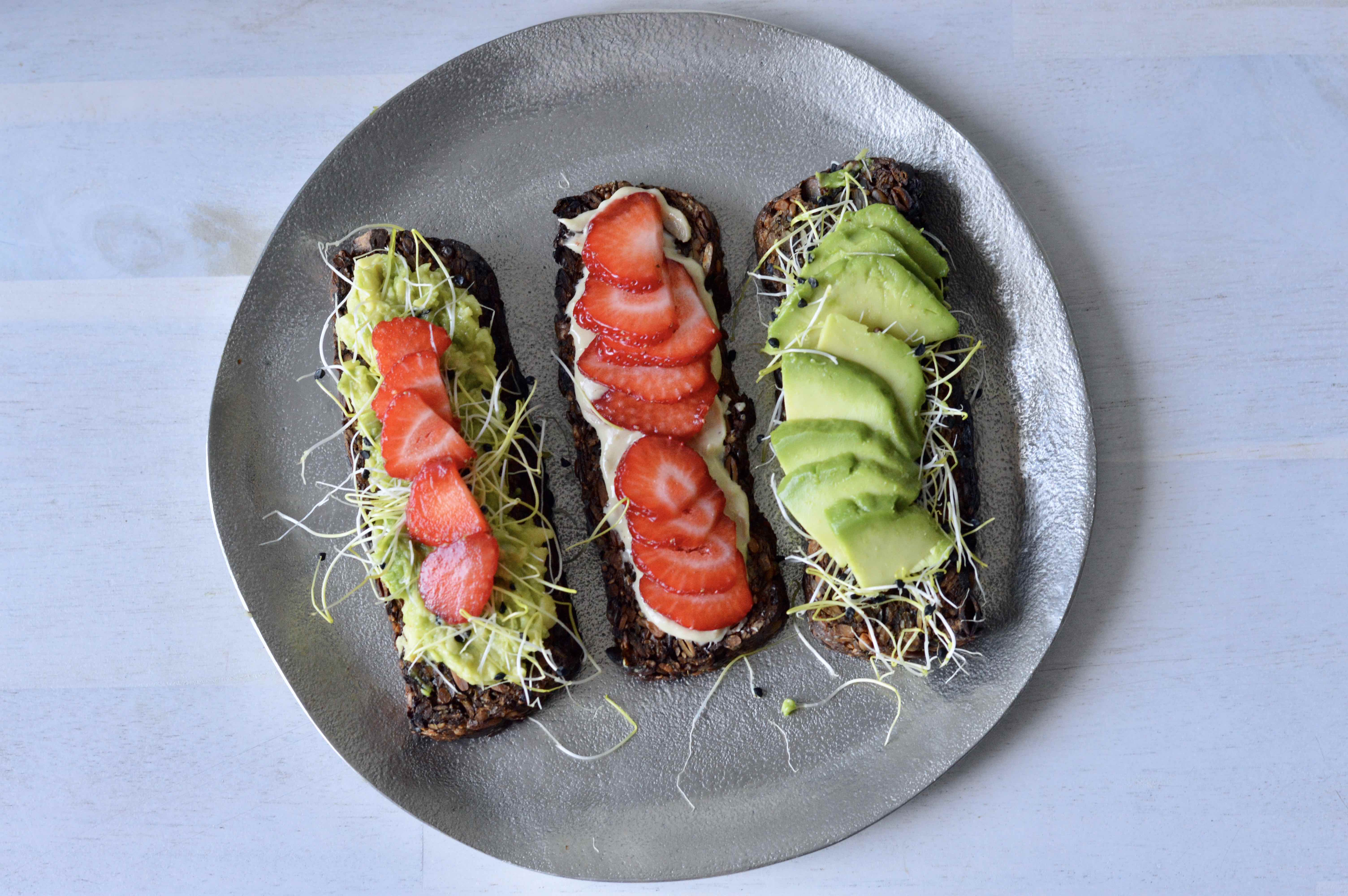 My favourite breakfast these days is spreading some creamy nut butter (almond or cashew) on the toast and topping it with thinly sliced strawberries. It is so good! For lunch, we’ve been having avocado toast— with thinly sliced or mashed avocados, a pinch of salt and sprouts. Dynamite!