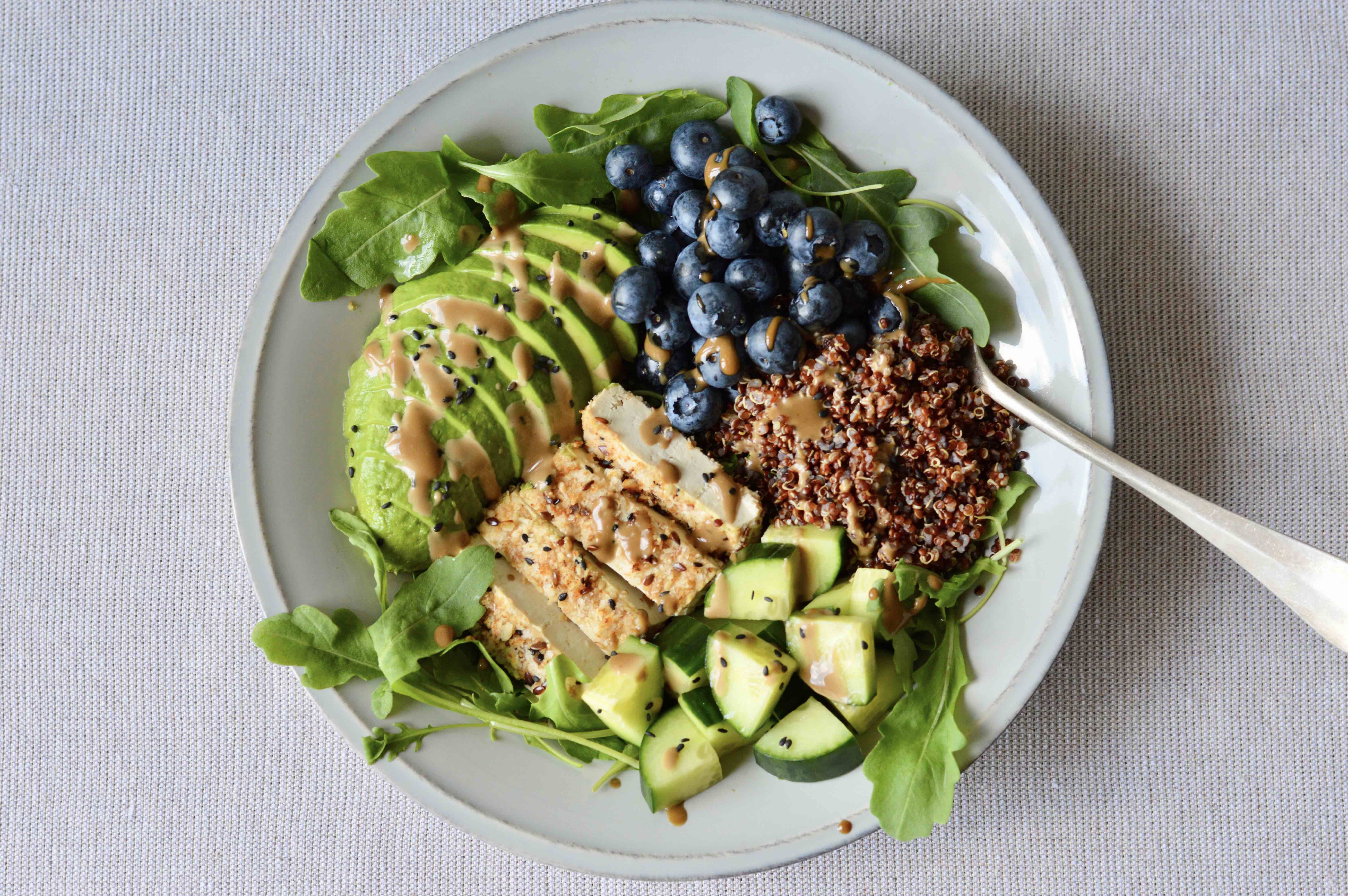 You can mix and match the ingredients as you prefer. For example, instead of crispy tofu, you can add grilled chicken or smoked salmon slices. You can replace the quinoa with cooked brown rice, noodles or farro. And, you can swap the blueberries for strawberries or peaches or melon slices.
