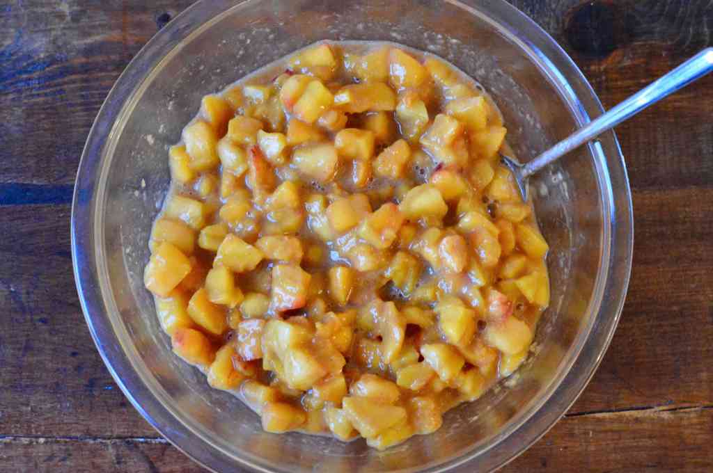 2. Transfer cubed peaches to a big bowl. Add the sugar, lemon juice, cornstarch and cinnamon. Toss to coat. Set peach mixture aside on counter to marinate for at least 20 minutes, tossing occasionally.