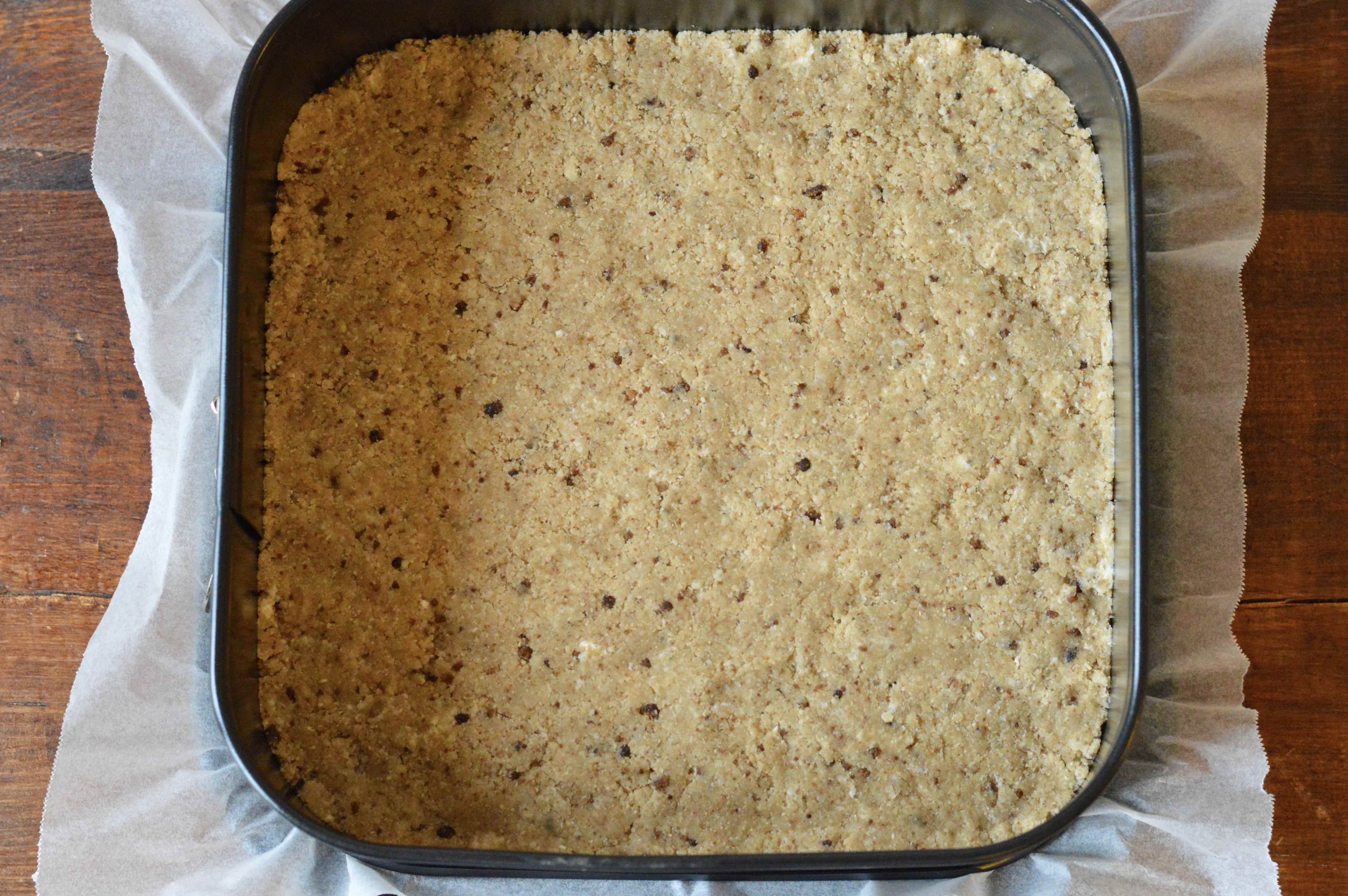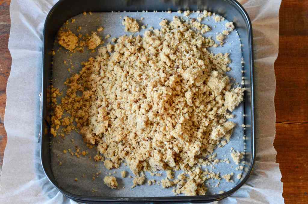 5. Remove half of the crumb mixture—2 cups, and place it into the square pan lined with parchment. Press down with your fingers to make a firm, even base, making sure to get into the corners.