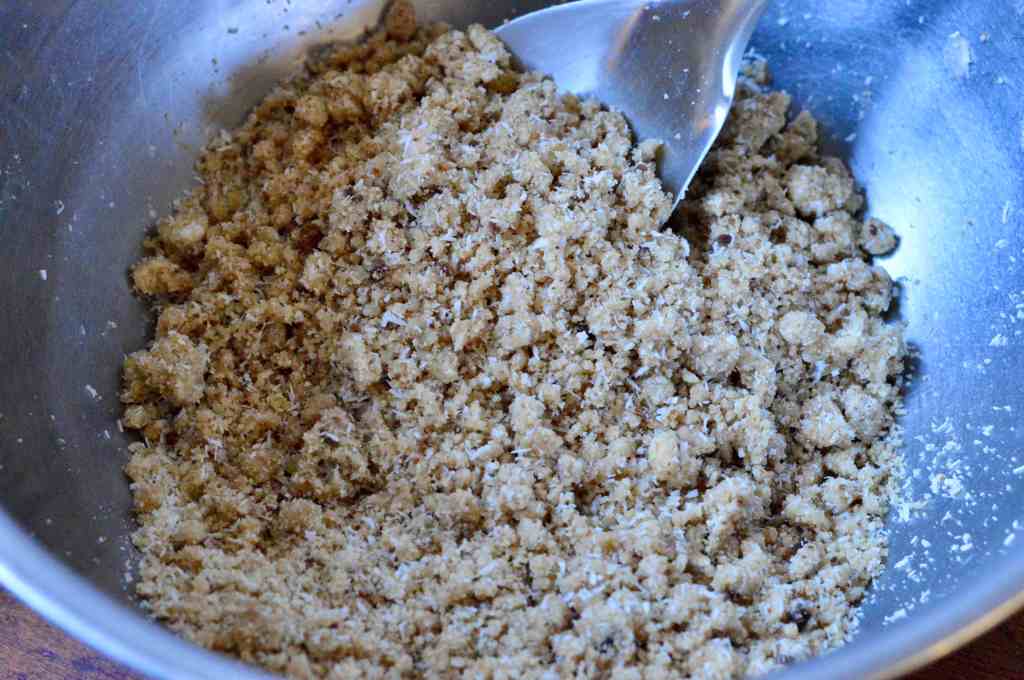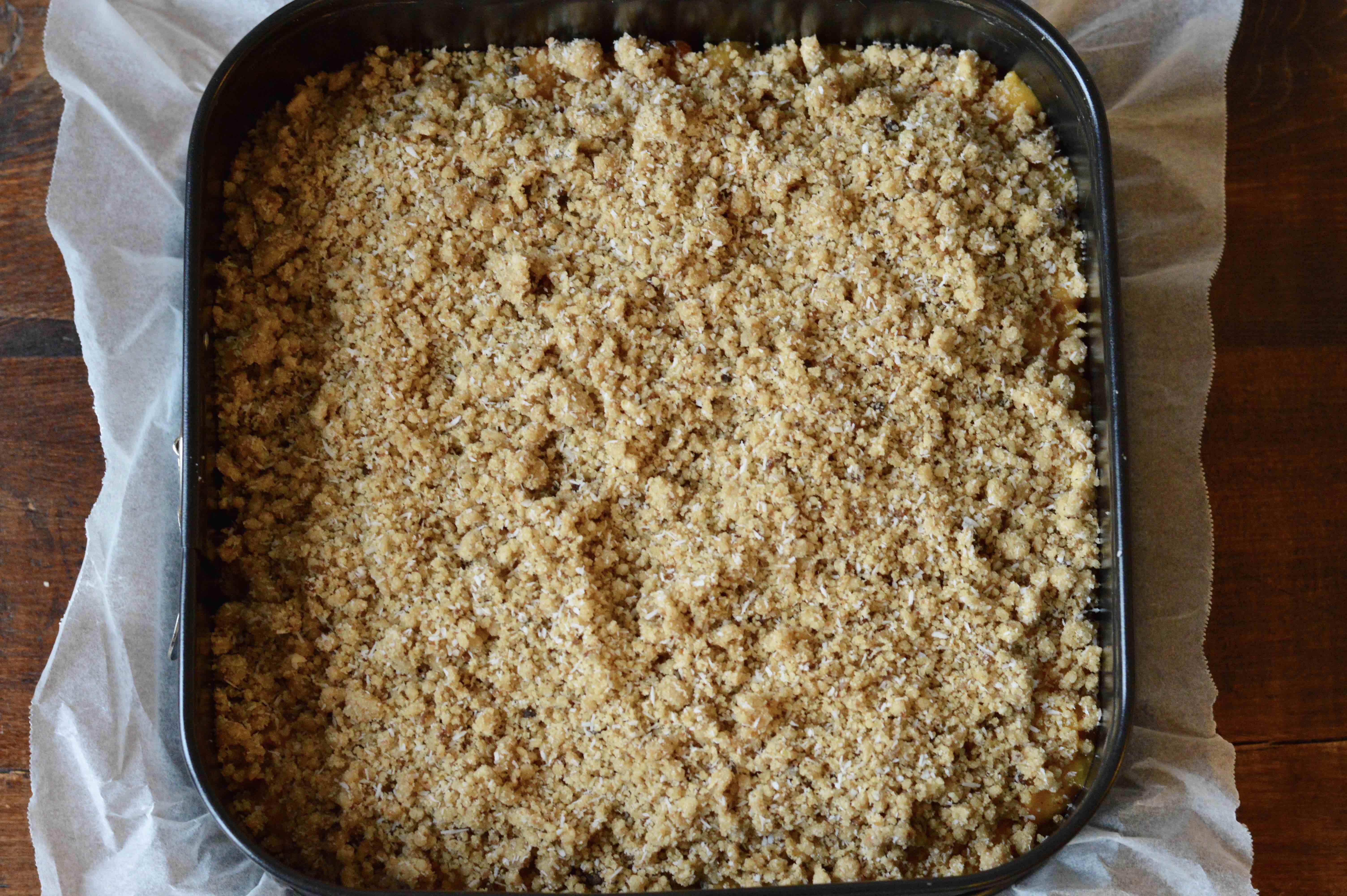 8. To the remaining 2 cups of crumb mixture, add 2 tablespoons of coconut or ground nuts. Mix together with fork then sprinkle all over on top of the peaches to create a crumble.