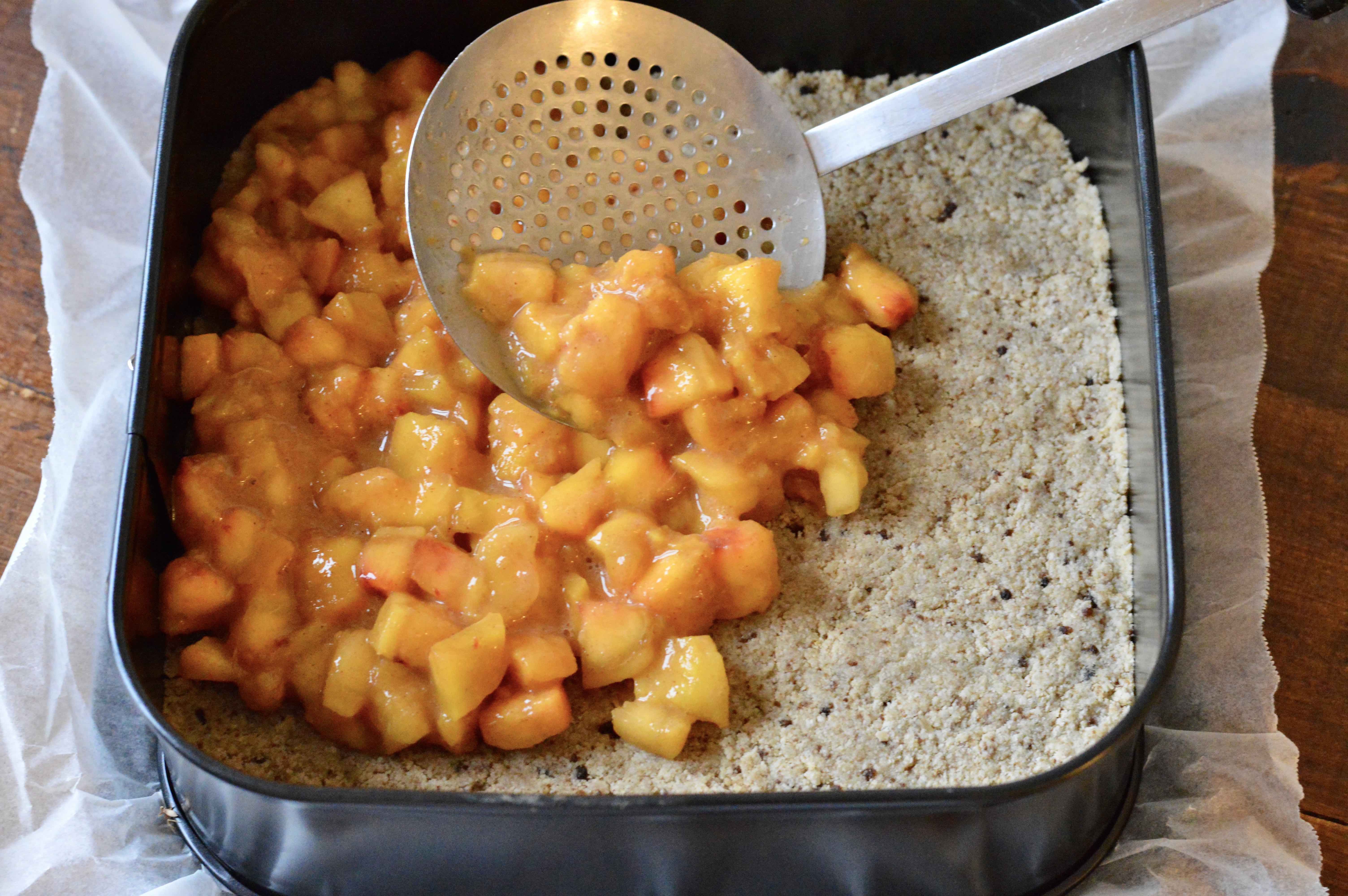 7. After 5-6 minutes, remove from oven. With a slotted spoon, leave excess peach liquid behind and spread the marinated peach mixture evenly on top of the pre-cooked base.