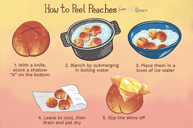 For the peaches: For better overall taste and texture, I recommend peeling the peaches. You can do this manually or blanch them. I prefer blanching. Blanching tenderises and sweetens the peaches, which is helpful if they are not very ripe. Removing the skin is also better if your peaches are not organic —fuzzy peach skin can hold a lot of pesticides. To blanch, bring to the boil a large pot of water. With the point of small knife, carve an X at the bottom of each peach and place them into the boiling water, cover and boil for one to several minutes —longer if your peaches are not ripe. Remove with a slotted spoon and place into a bowl with very cold water (can add a few ice cubes, but I don’t find it necessary). Add more cold tap water if it warms up. Peel the skins by hand or with a peeler. Repeat with more peaches. If you’ve blanched and cubed more than needed, store them in a sealed container in the fridge for later. Blanched peaches are a delicious treat!