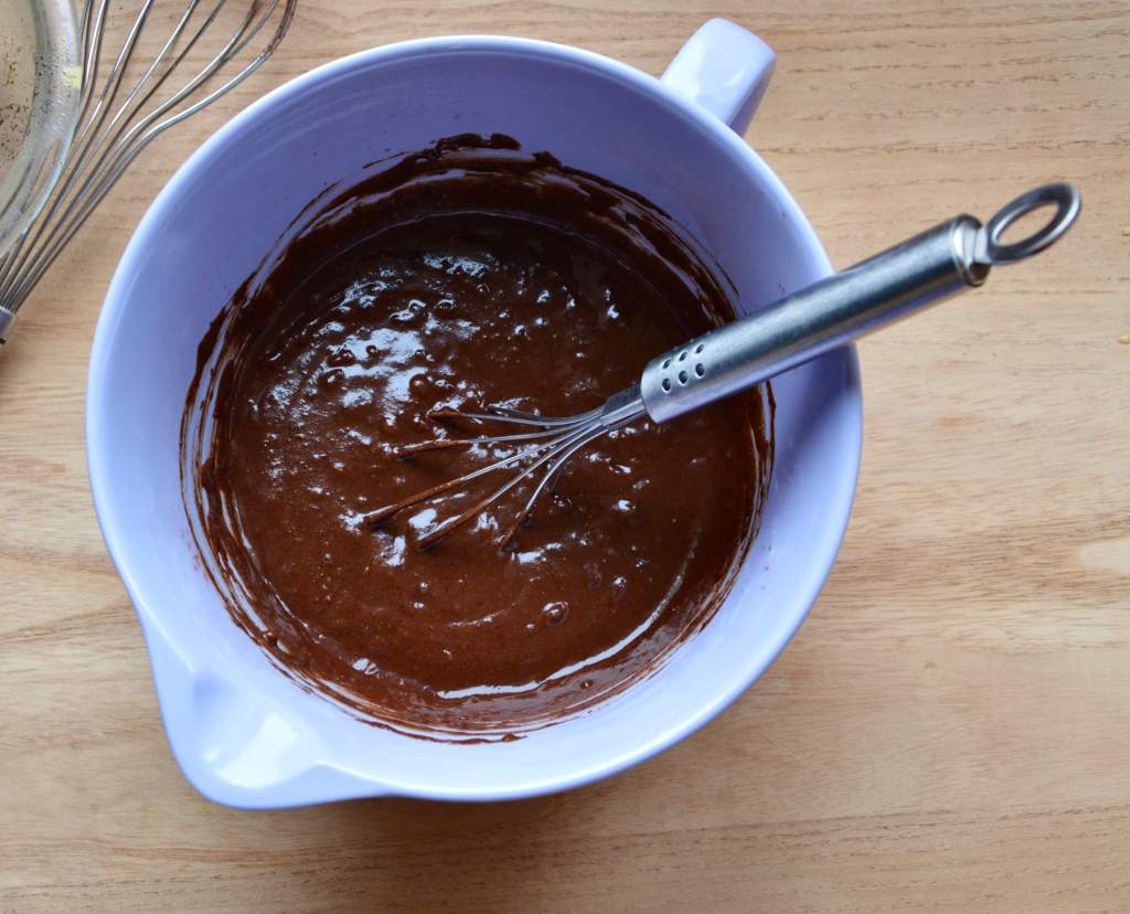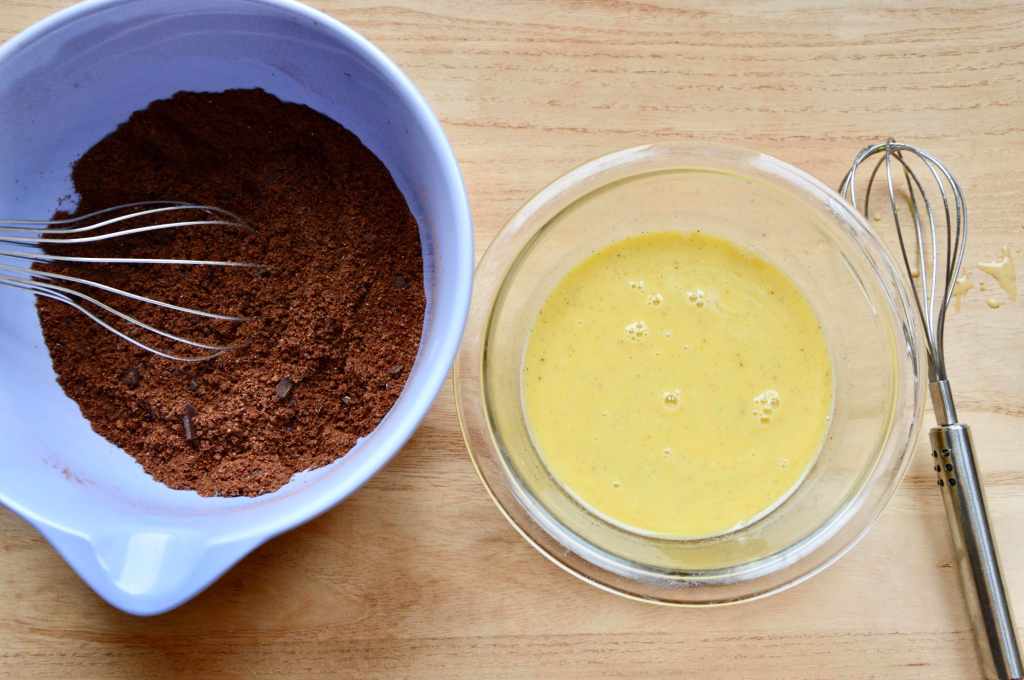 1. In a big bowl, hand whisk the dry ingredients until combined. In a separate smaller bowl, hand whisk the eggs with the remaining wet ingredients until combined and lightly frothy at the top.
