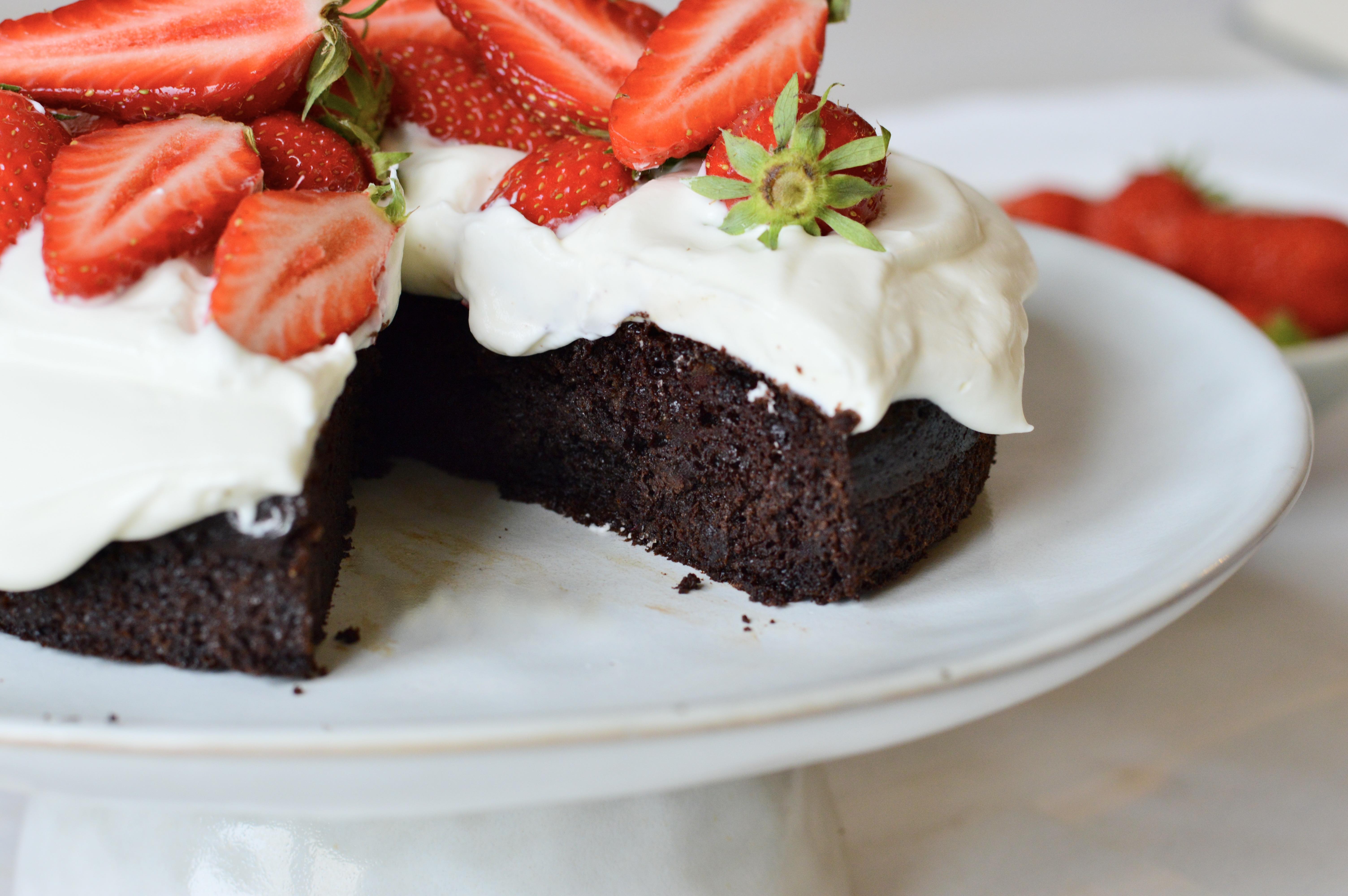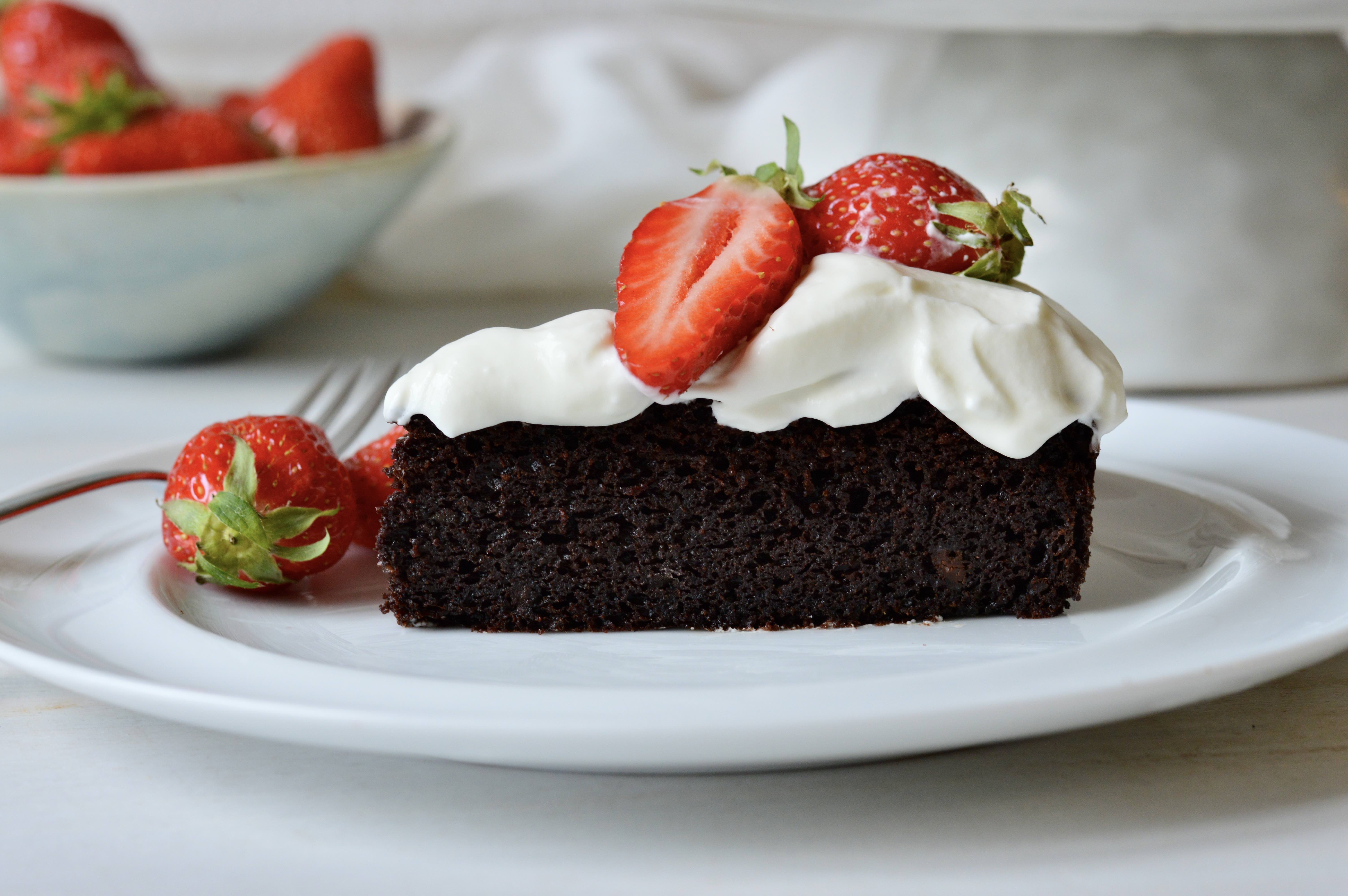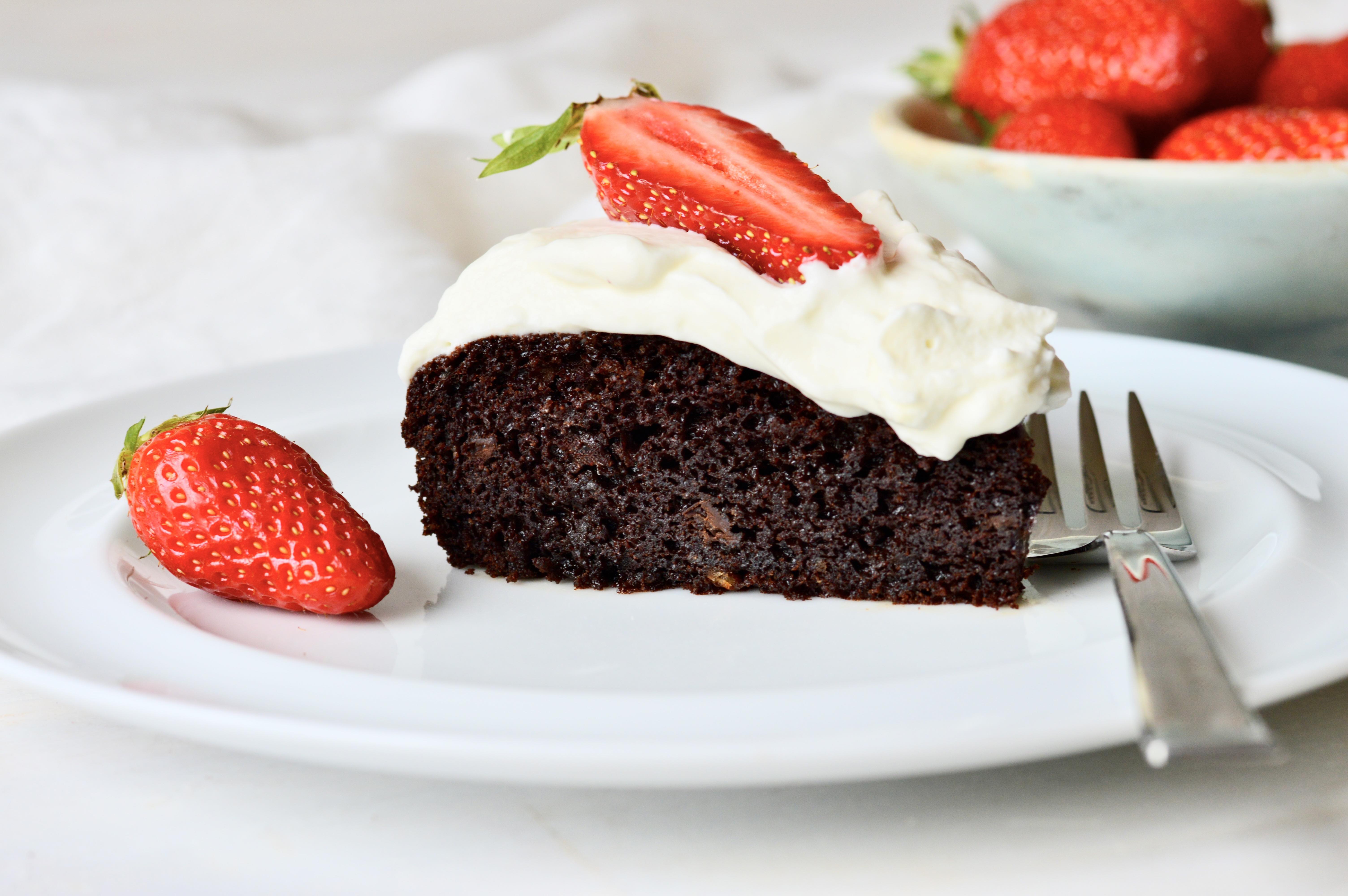 If you like chocolate cake, this one is worth trying. I like to serve it with whipped yoghurt cream and fresh strawberries, but you can enjoy it as is or dusted with icing sugar.
