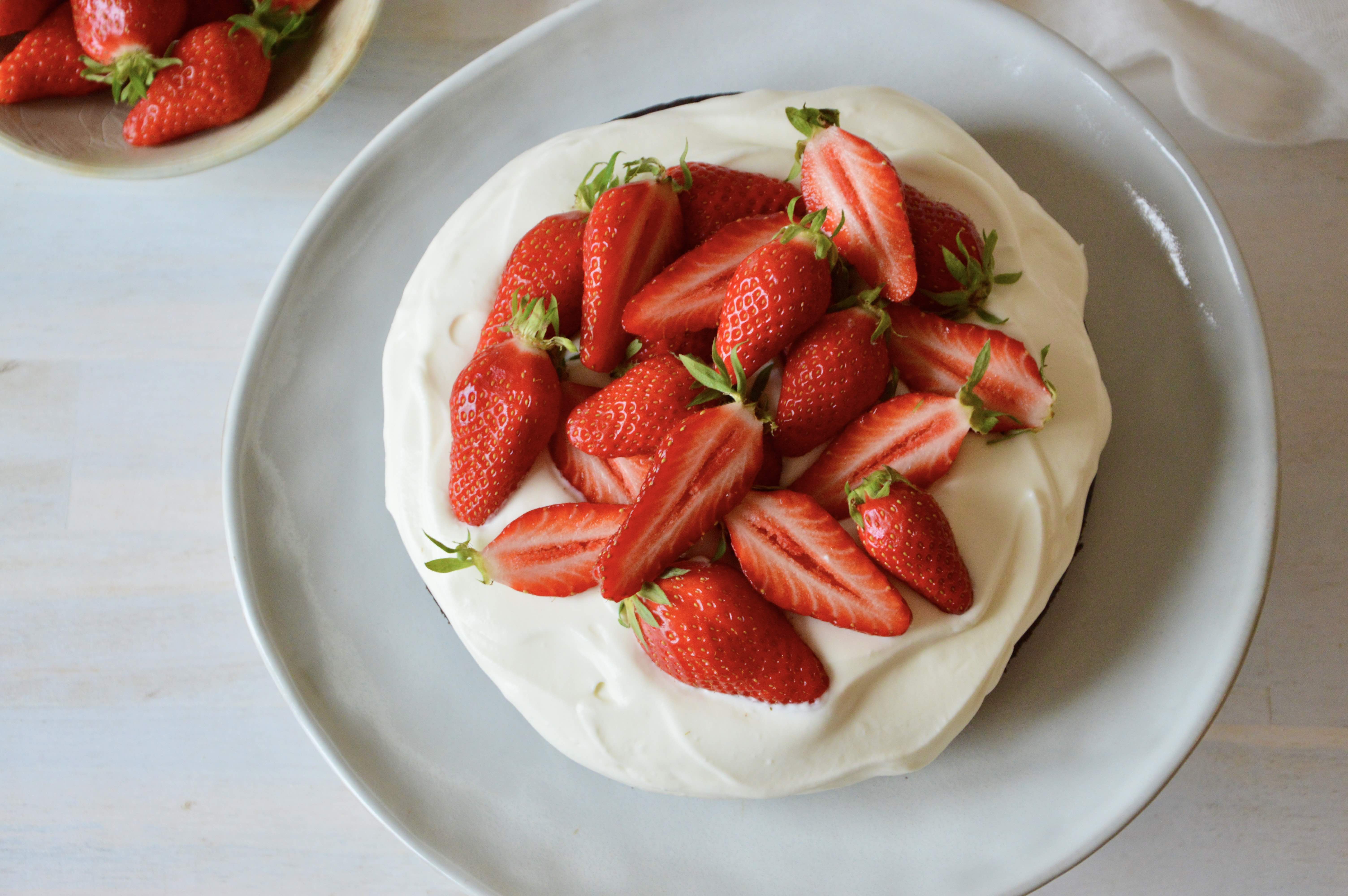 3. Spread on completely cooled cake or add a dollop of cream to individual portions. Serve with fresh strawberries. Store leftover cream in a sealed container in the refrigerator for a few days.