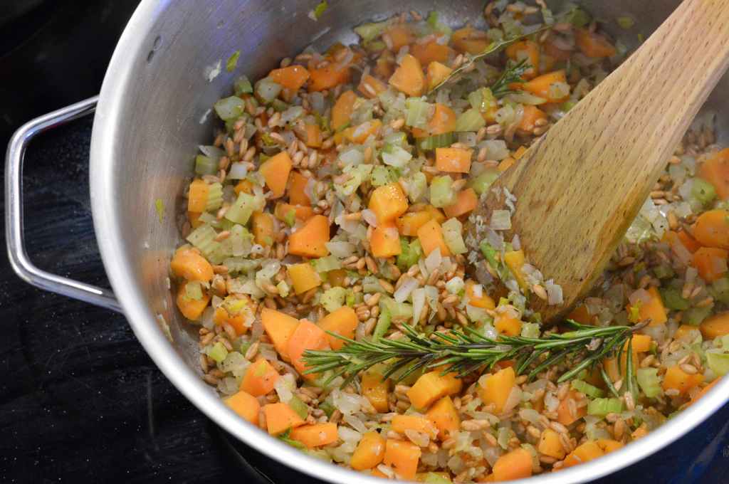 3. Add the dry farro (or brown rice) and sauté for 2 minutes.