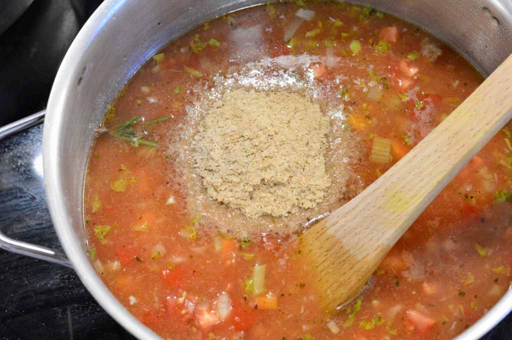 4. Add the veggie broth, tomatoes with their juices + tomato pulp and nutritional yeast. Mix well.