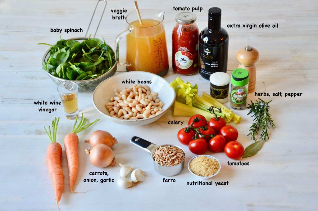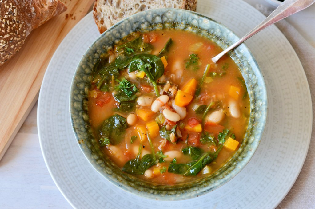 This soup is a variation of the Tuscan bean soups from the Tuscany region of Italy. Along with cooked white beans, I made it with onion, carrots, celery, garlic, farro, ripe tomatoes and tomato pulp, herbs and lots of fresh spinach.
