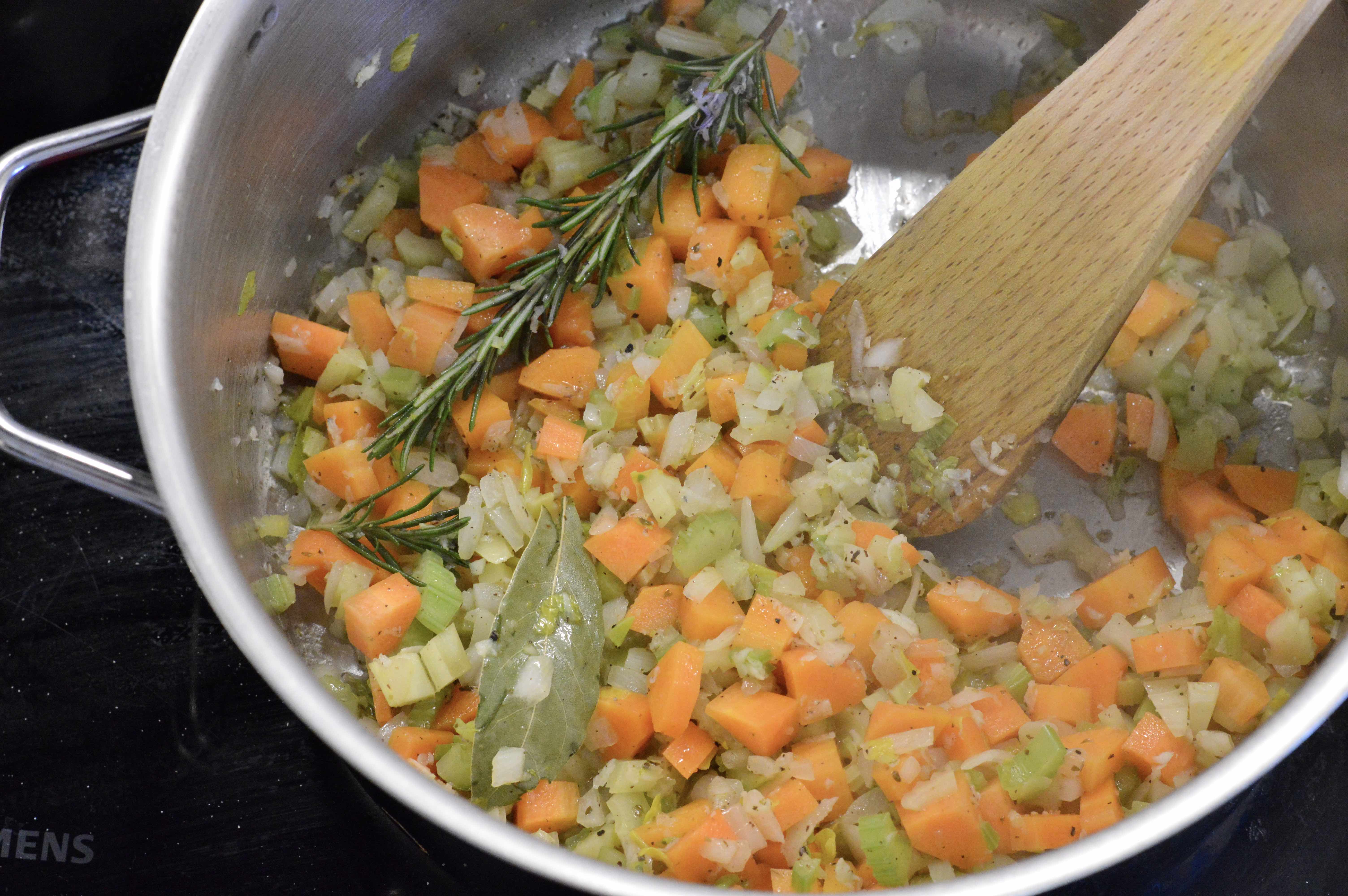 2. Add the onion, carrots, celery, grated garlic, herbs, salt and pepper. Lower heat and sauté until the vegetables are tender, about 4 minutes.