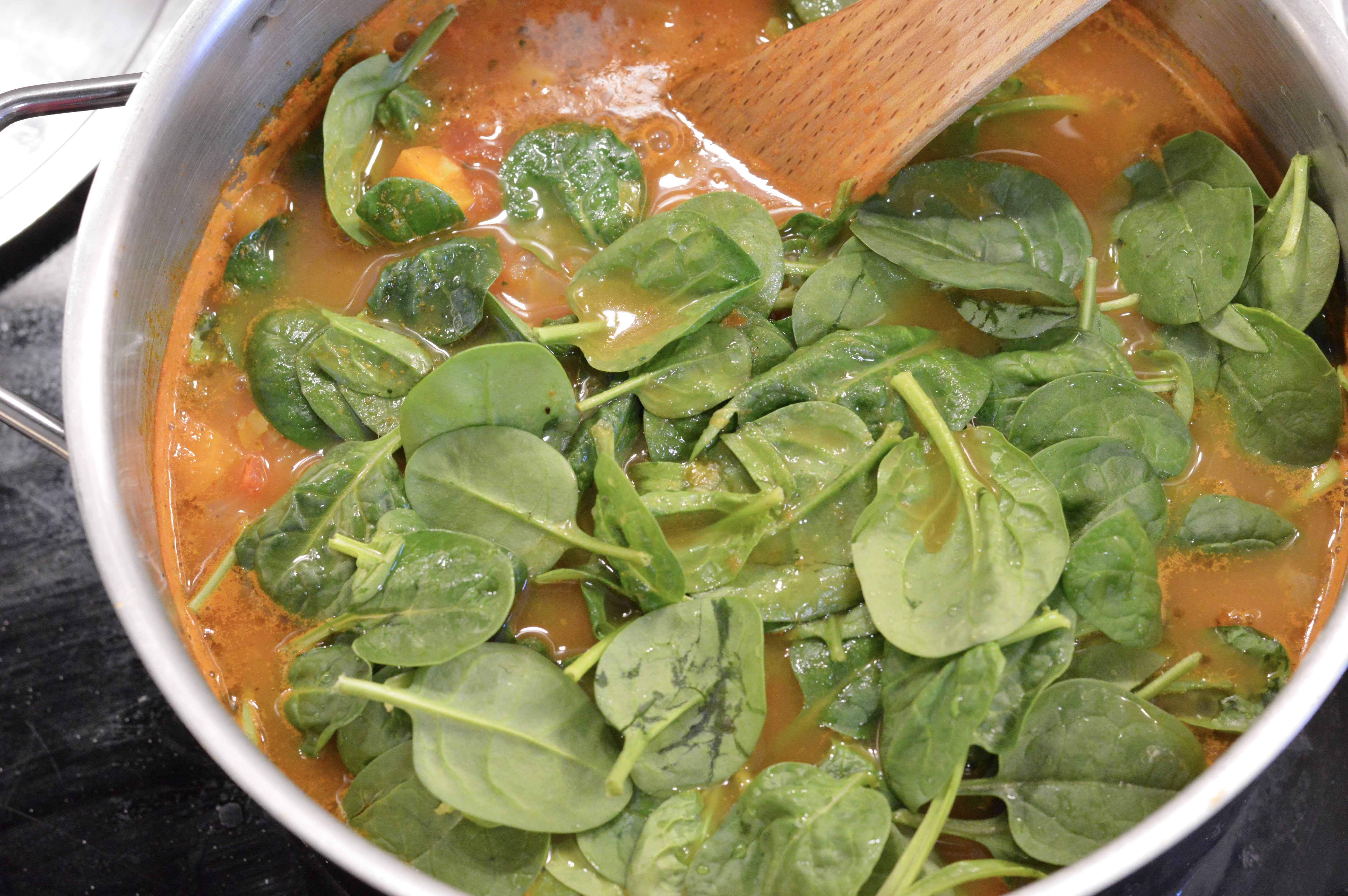 6. When farro is tender, add the baby spinach in handfuls and the white wine vinegar. Mix until the spinach is wilted.